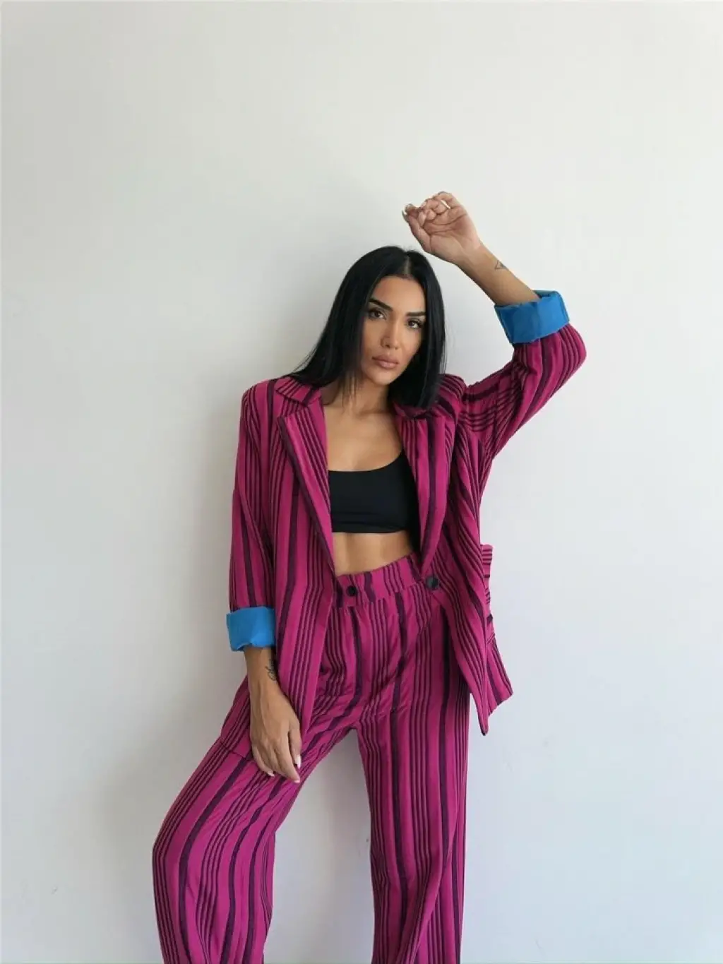 OTTOMAN ÇİZGİLİ CEKET-PANTOLON TK - Fuşya