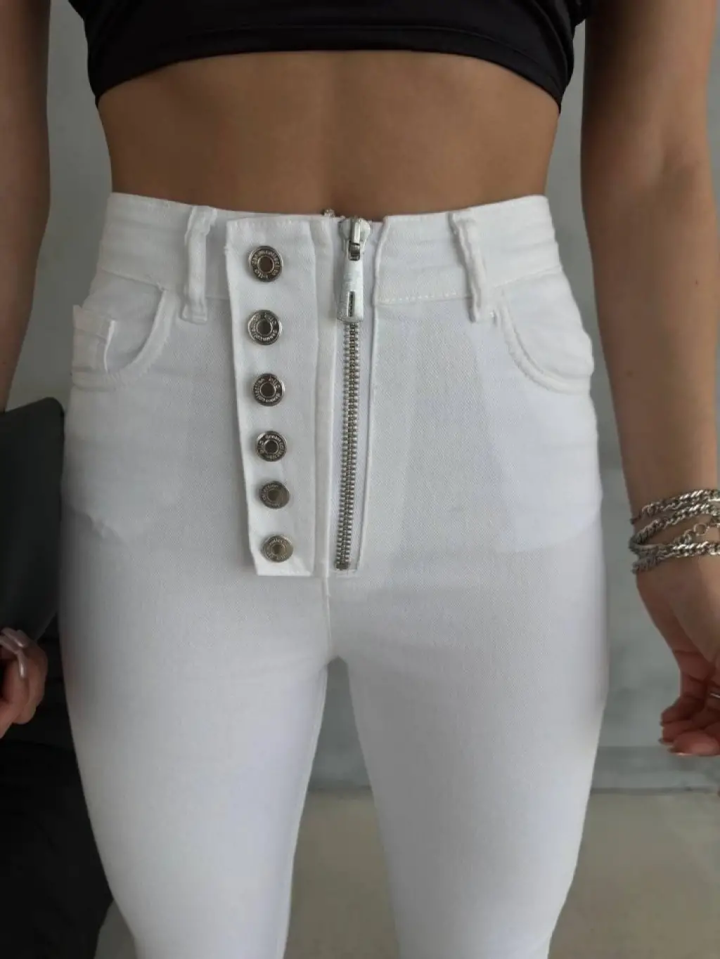 Beyaz Düğme Fermuarlı Kot Pantolon