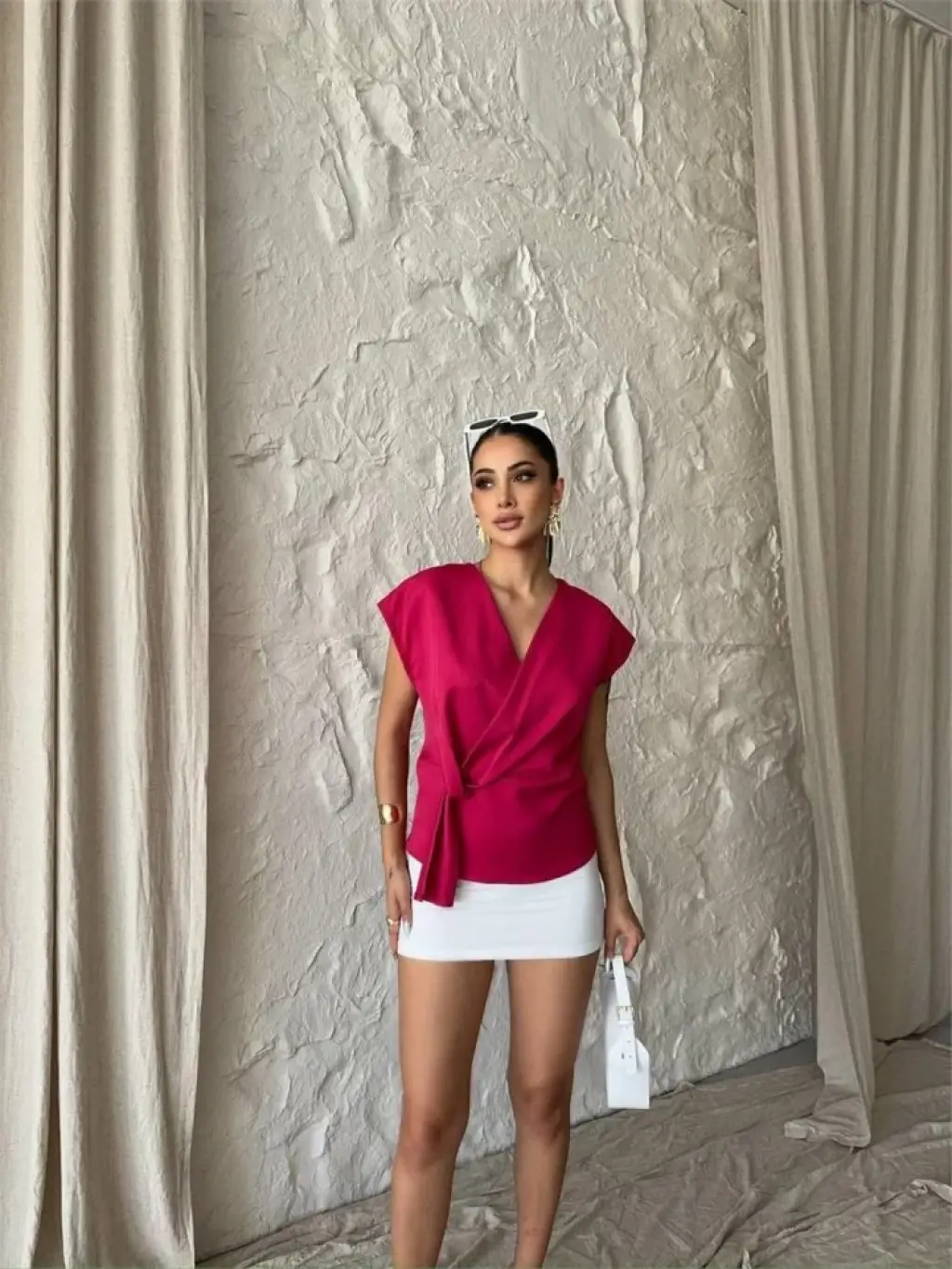 YANDAN BAĞLAMA DETAYLI KOLSUZ BLUZ - Fuşya