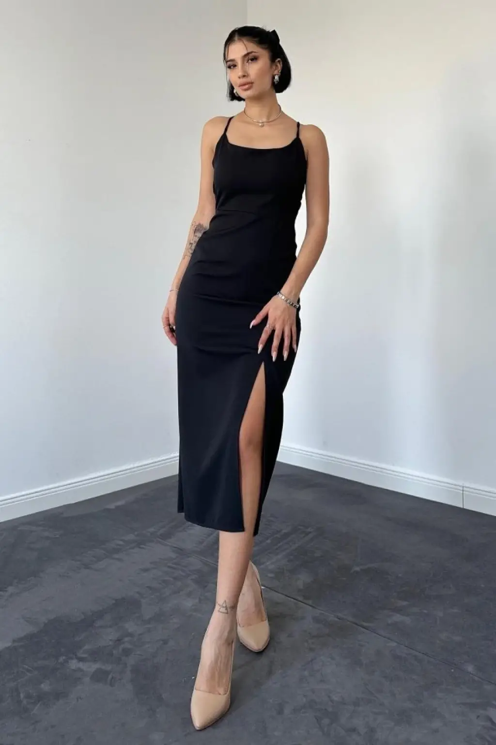 Kadın Truvakar Kollu Bisiklet Yaka Kemersiz Yırtmaç Detaylı Uzun Ithal Krep Elbise