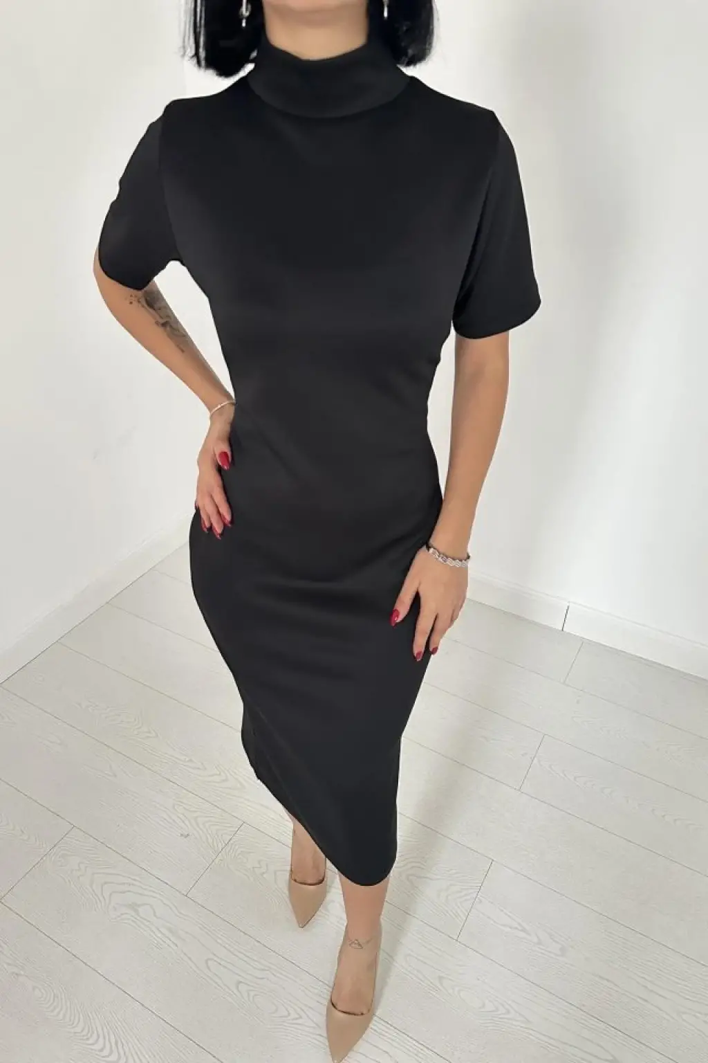 Kadın Kısa Kollu Yakadan Ve Etekten Fermuarlı Midi Viskon Iki Iplik Elbise