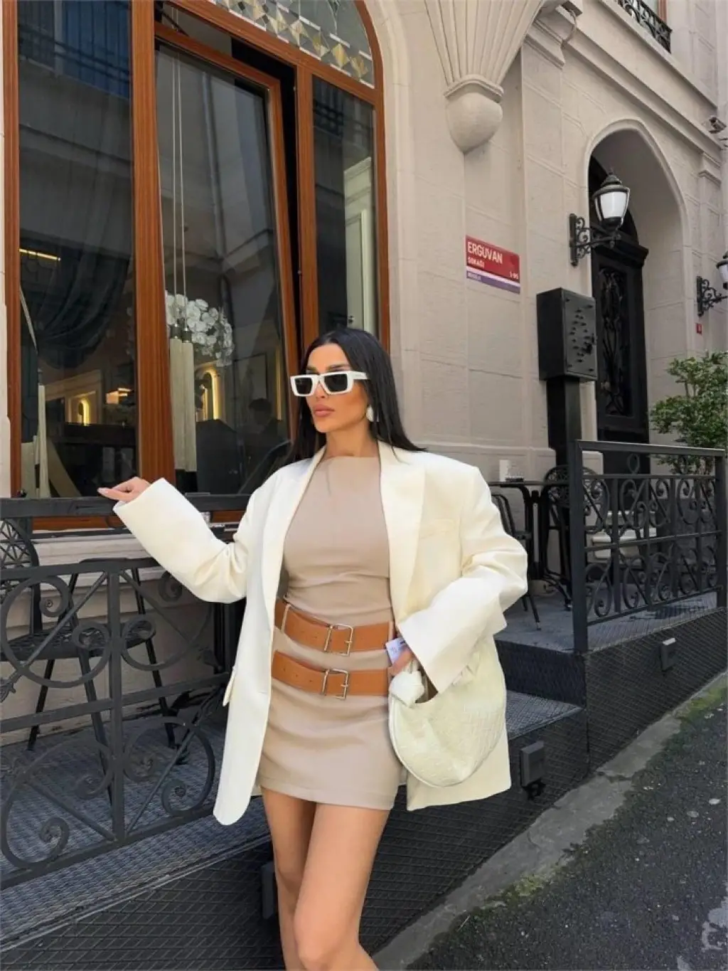 POLYVİSCON ÇİFT KEMER DETAYLI ELBİSE - Bej