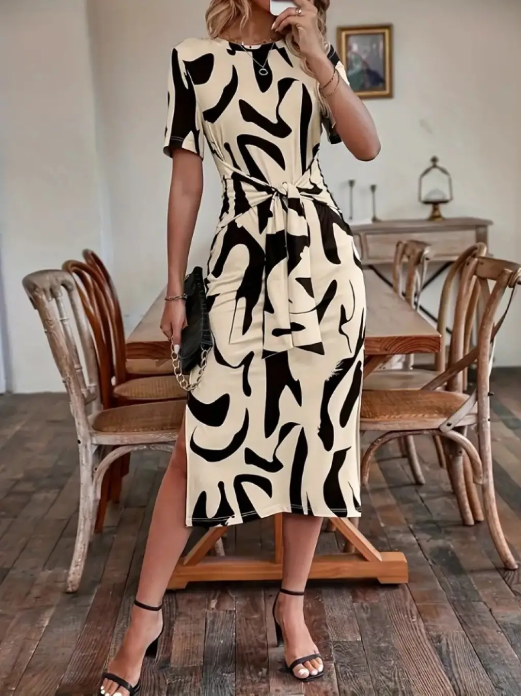 Kadın Kısa Kollu Bisiklet Yaka Desenli Belden Bağlamalı Yandan Yırtmaçlı Süprem Elbise