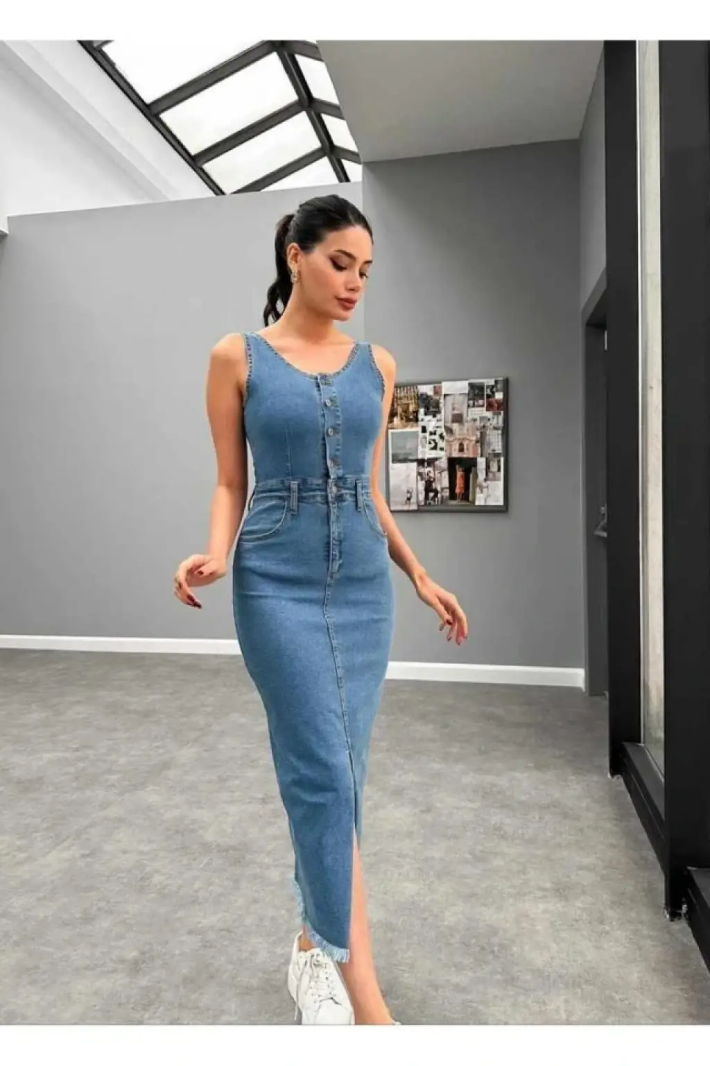 Mavi Likralı Kot Jile Elbise
