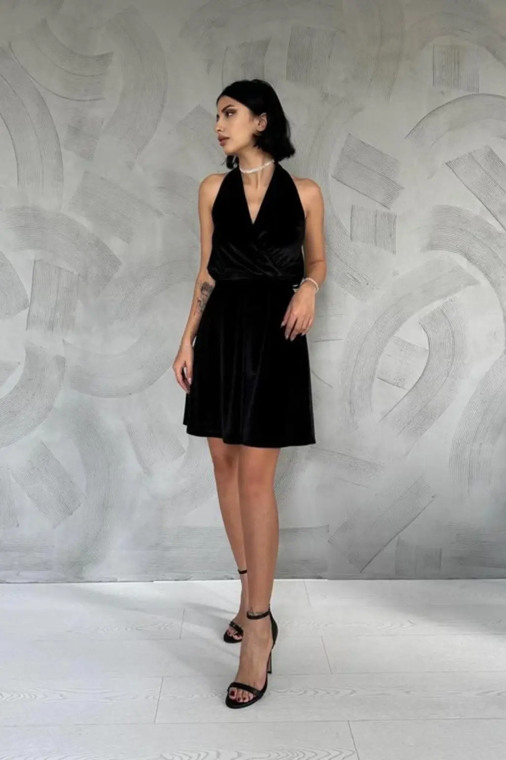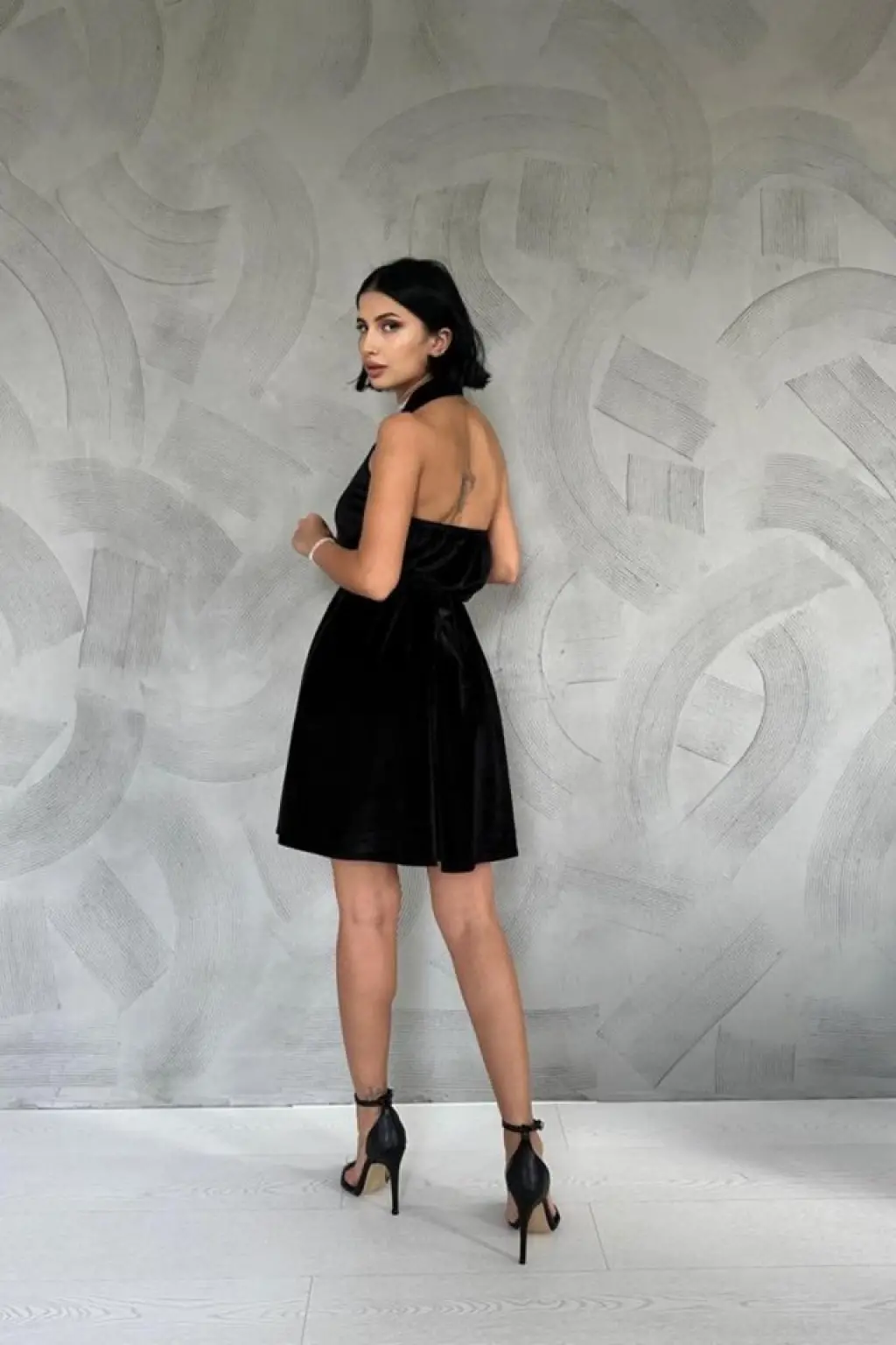 Kadın Kolsuz Omzu Volanlı Bisiklet Yaka Kaşkorse Mini Elbise