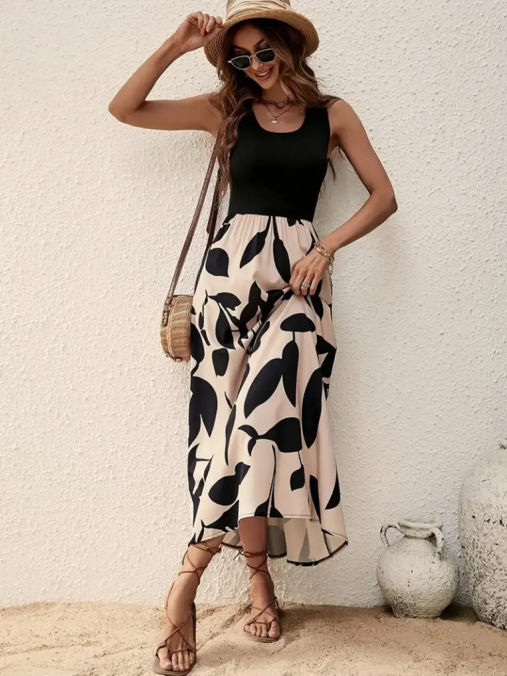 Kadın Askılı Yuvarlak Yaka üst Viskon Alt Desenli Uzun Süprem Elbise