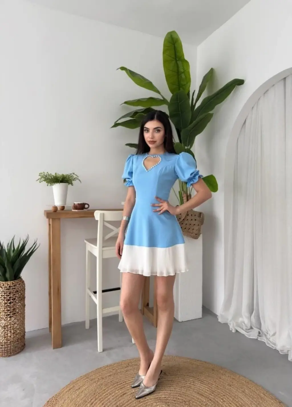 Kadın Truvakar Kol çift Renkli Düğmeli Kısa Ithal Krep Elbise