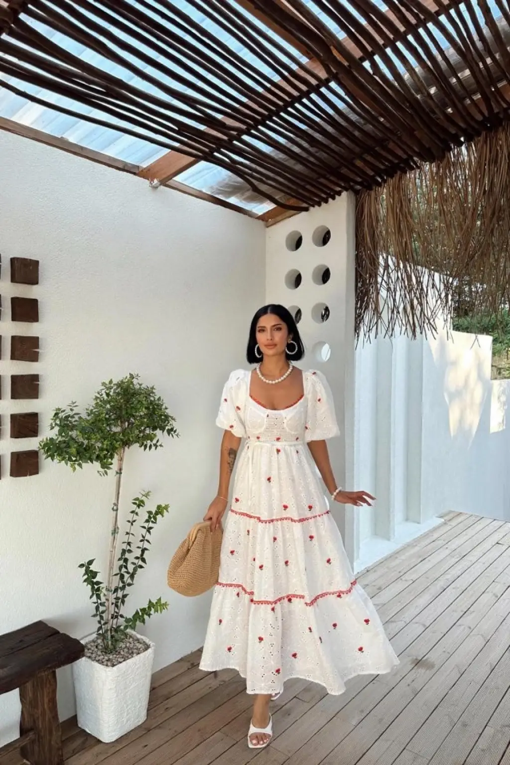 Nar Çiçeği Dantel Detaylı Brode Elbise
