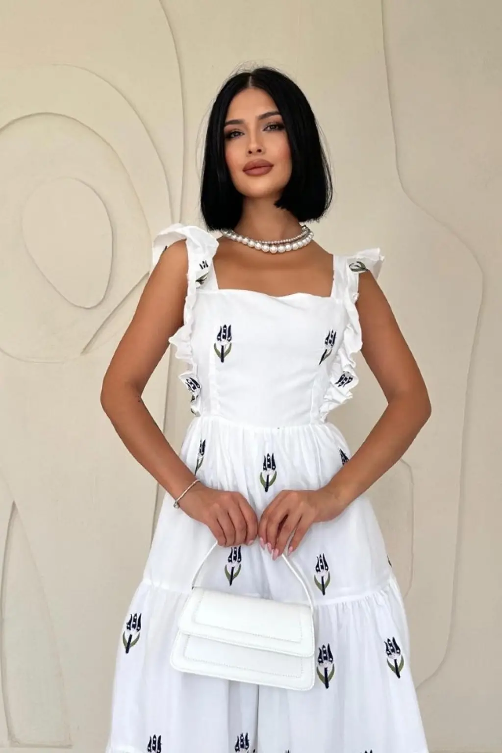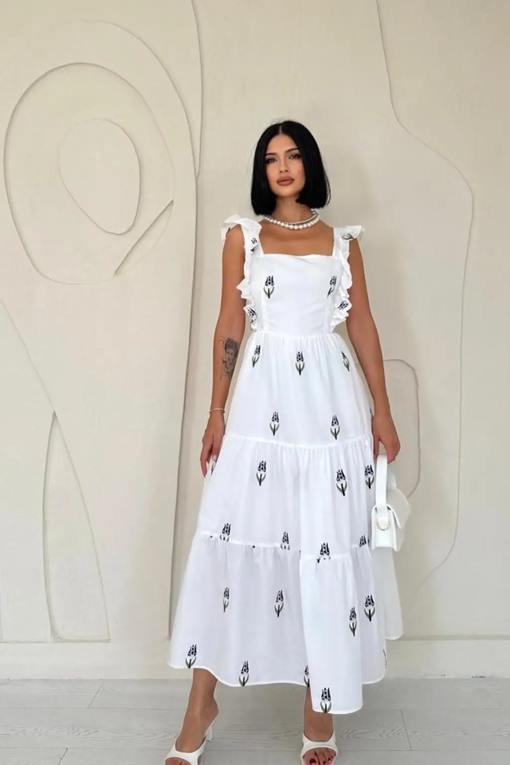 Kadın Askılı Kruvaze Yakalı Fırfırlı Janjan Krep Elbise
