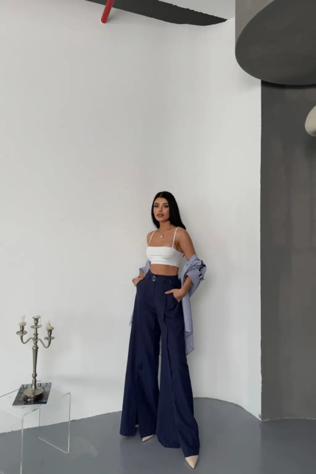 Kadın Yüksek Bel Geniş Paça Detaylı Cepli Ithal Krep Pantolon