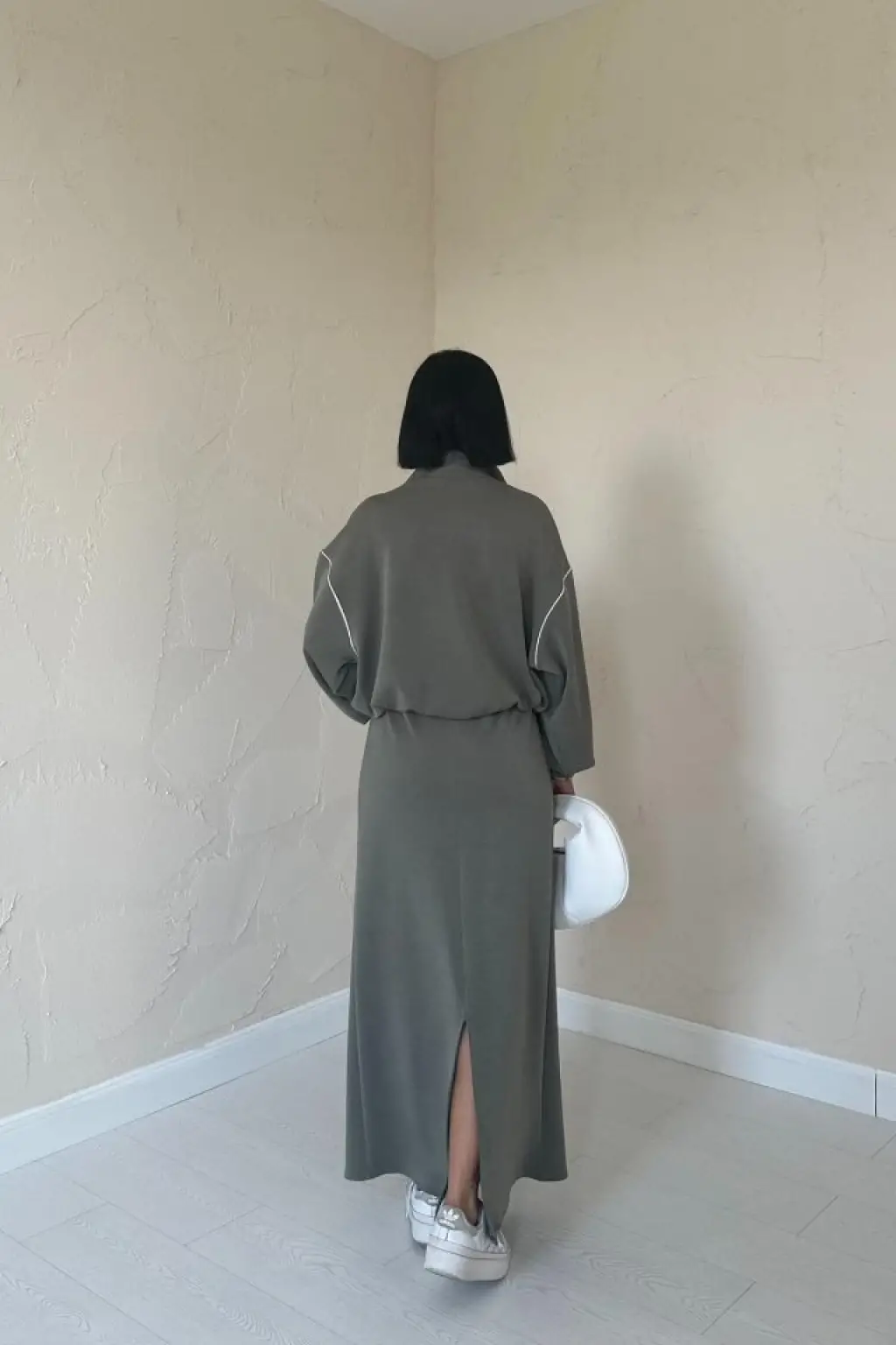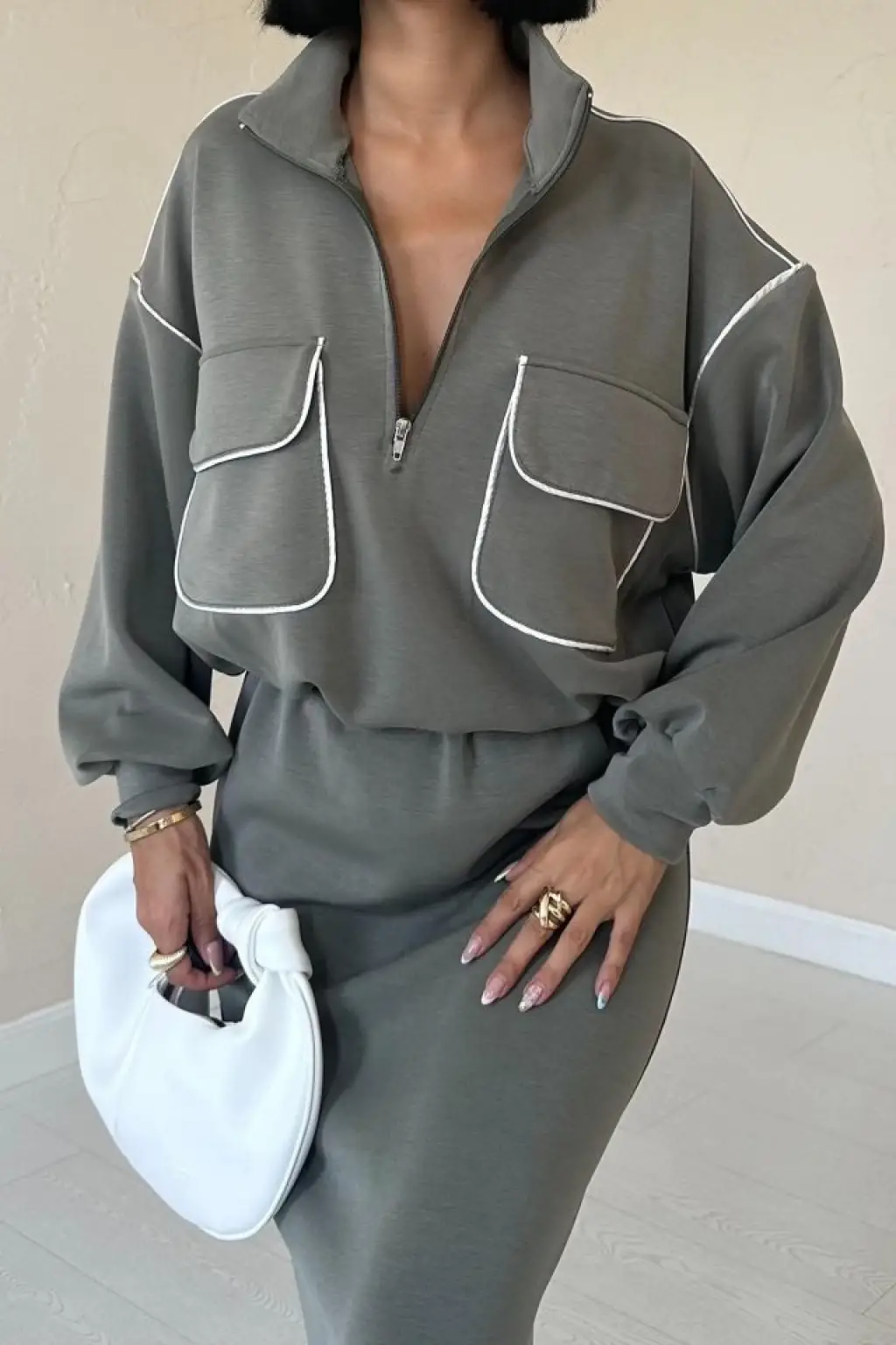 Haki Biyeli Sweatshirt Ve Etek Takım