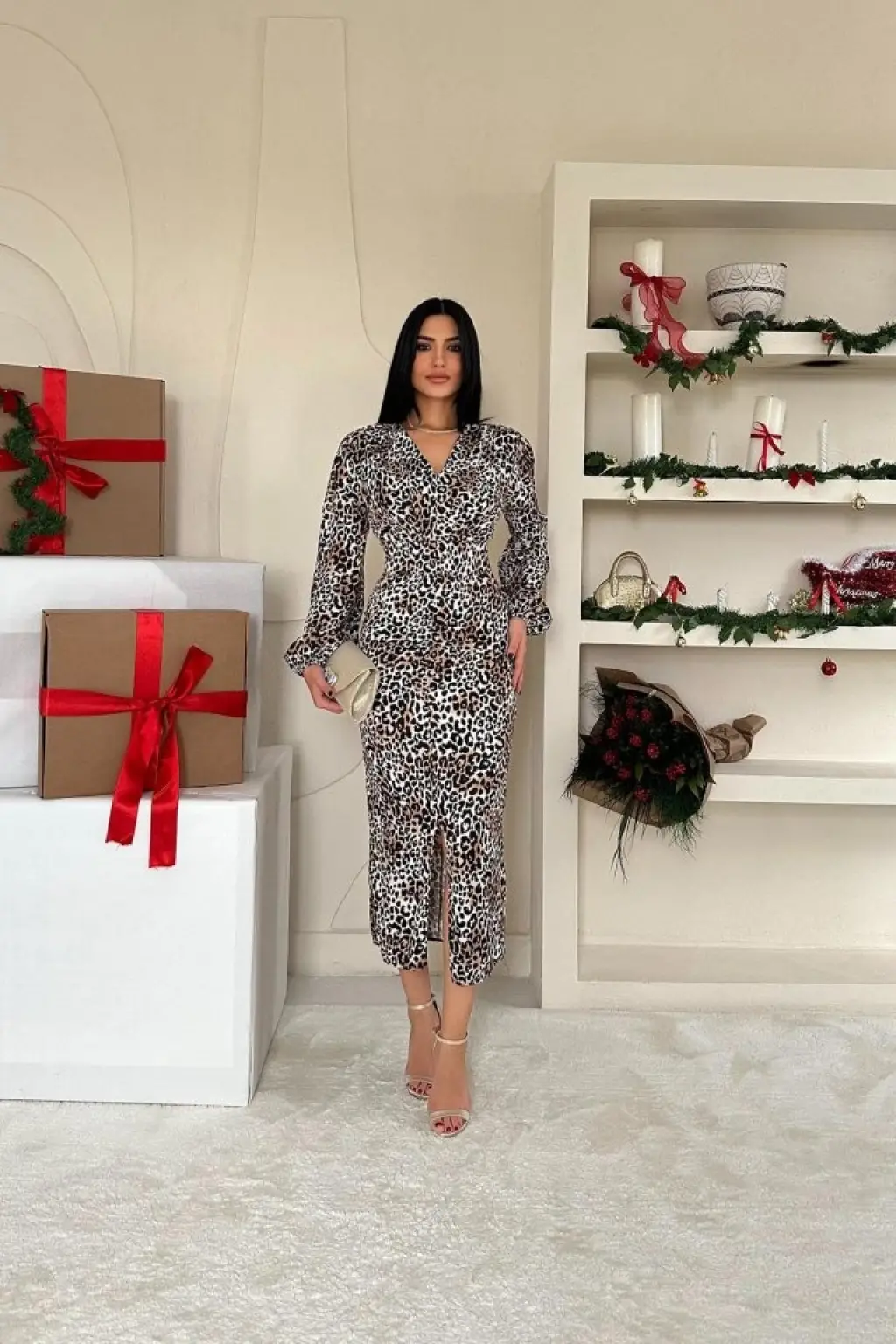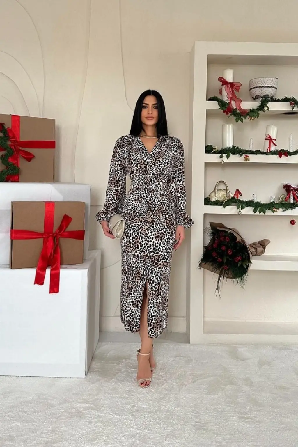 Leopar Önü Yırtmaçlı V Yaka Elbise