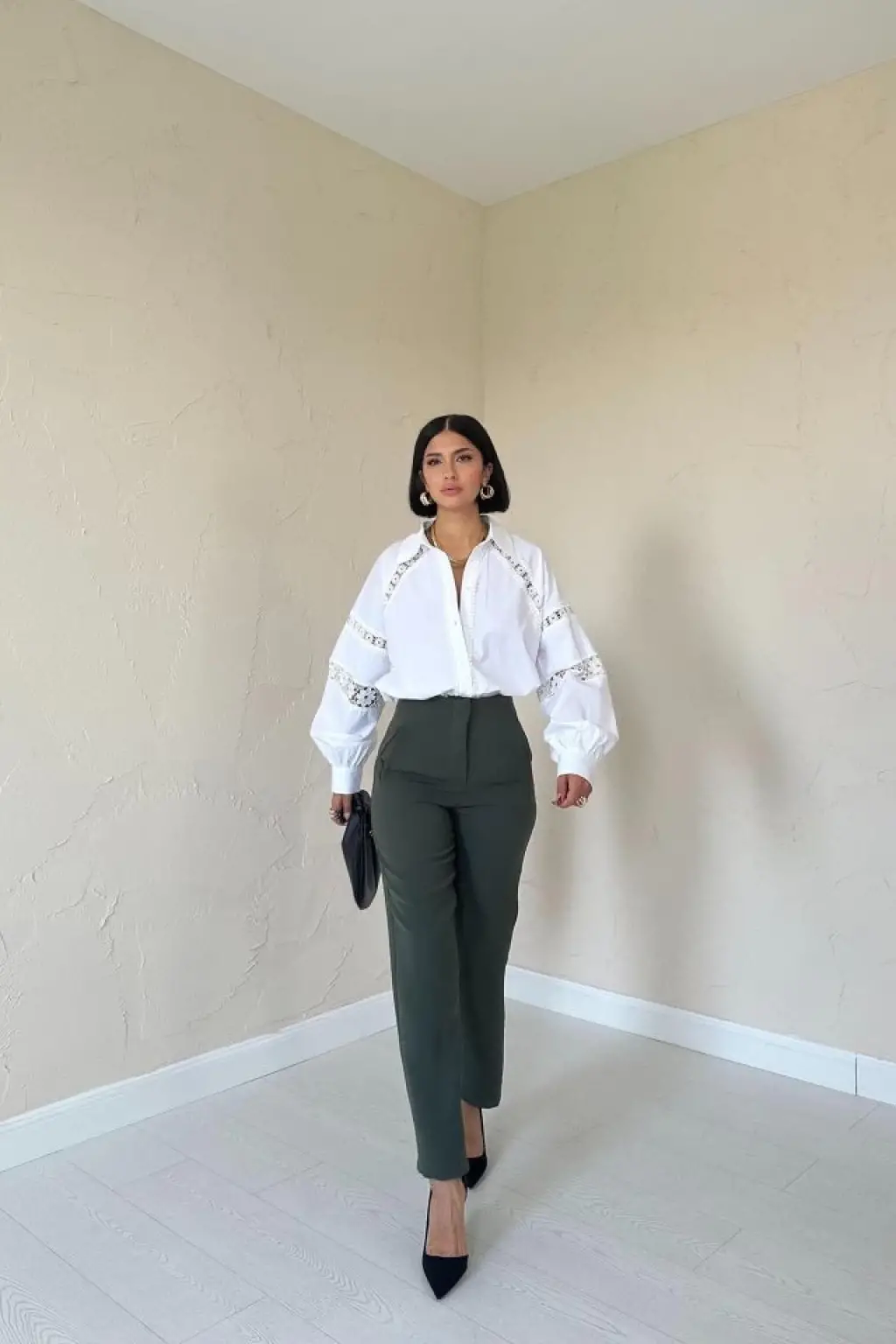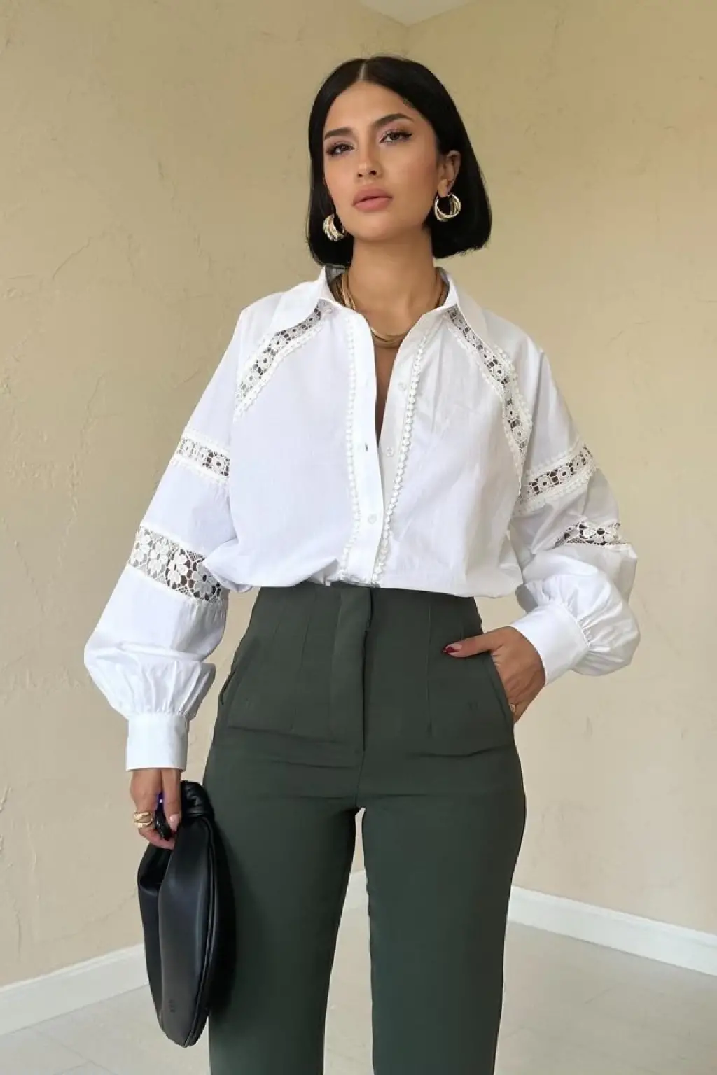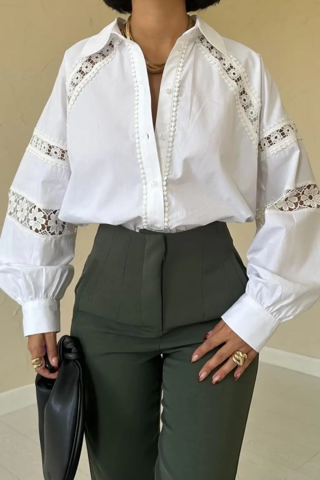 Kadın Uzun Kollu Hakim Yaka Tül Detay Ithal Krep Bluz