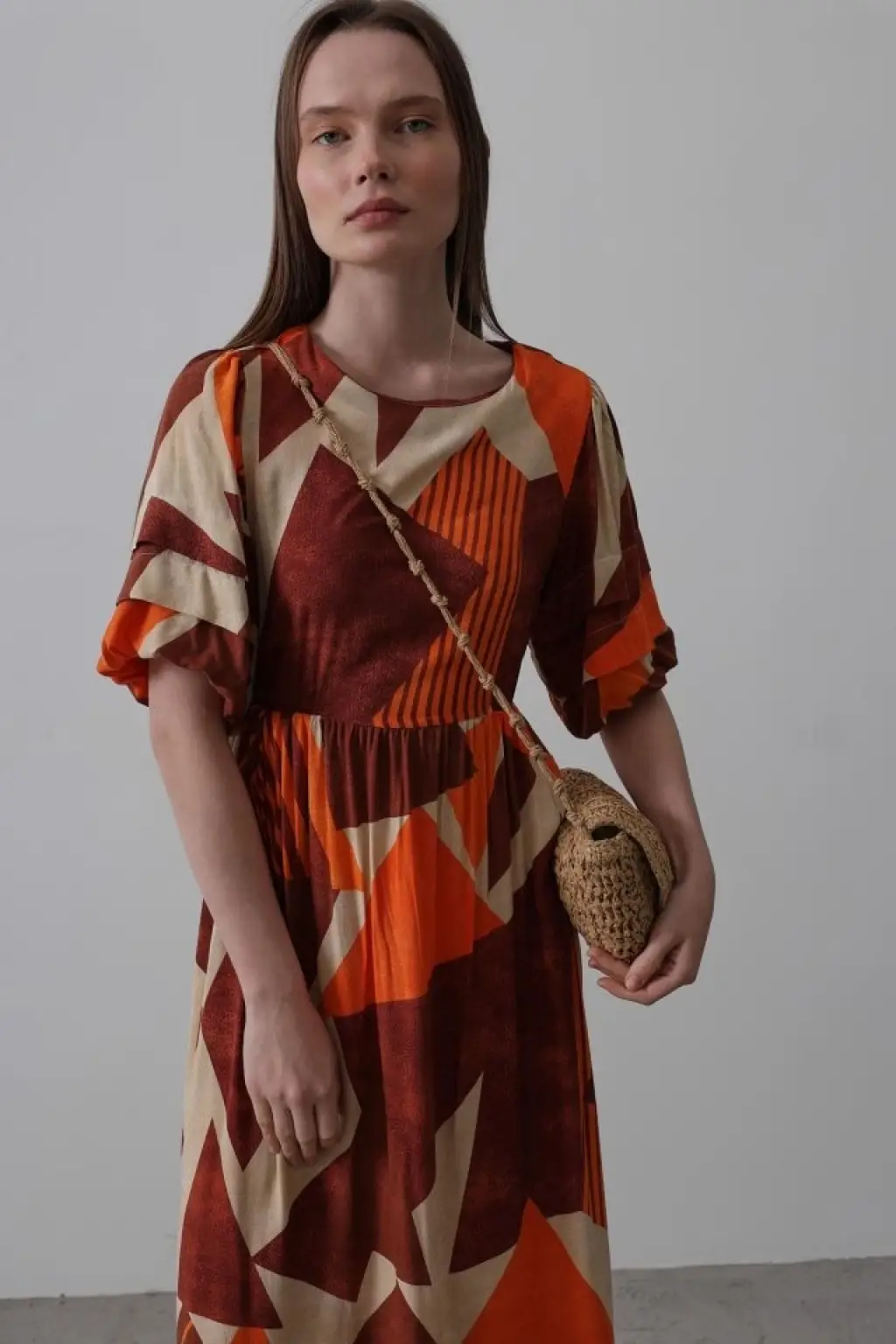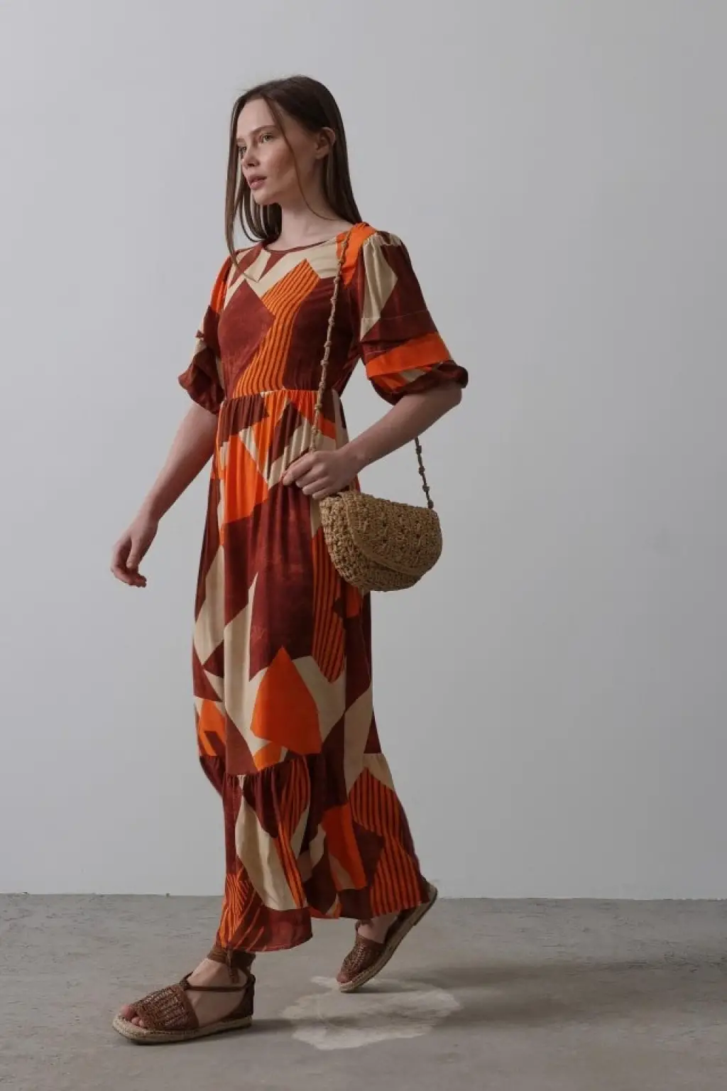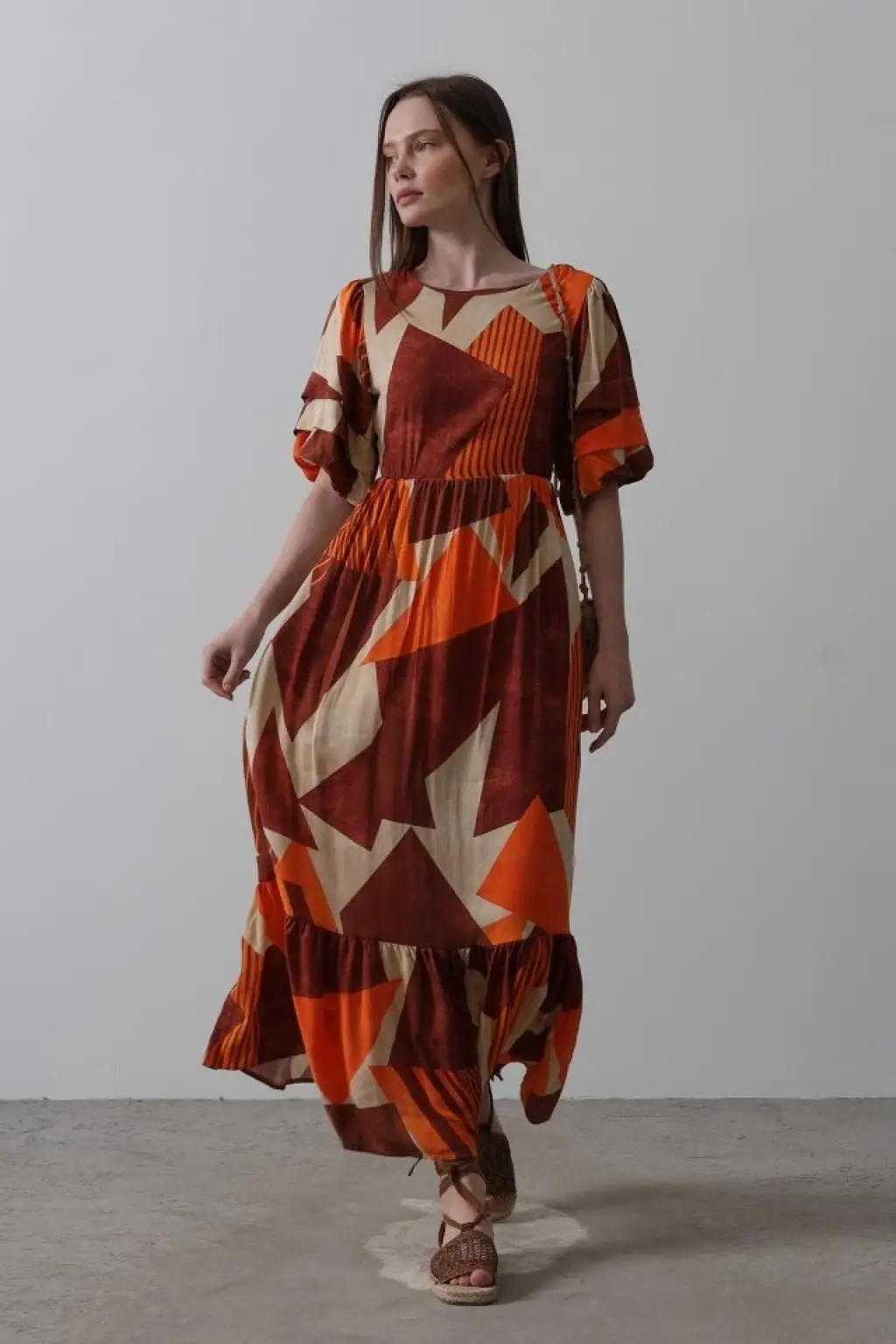 Desenli Balon Kol Kloş Elbise - Kahve
