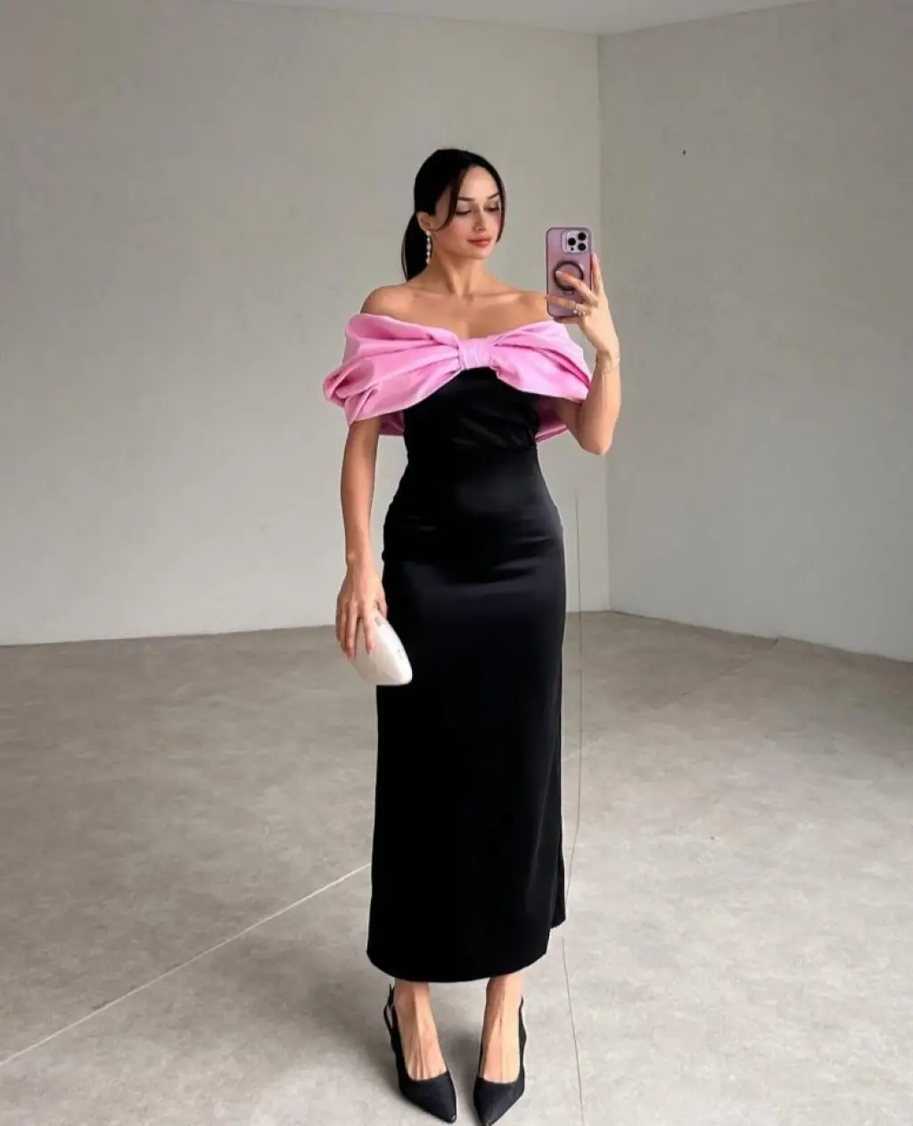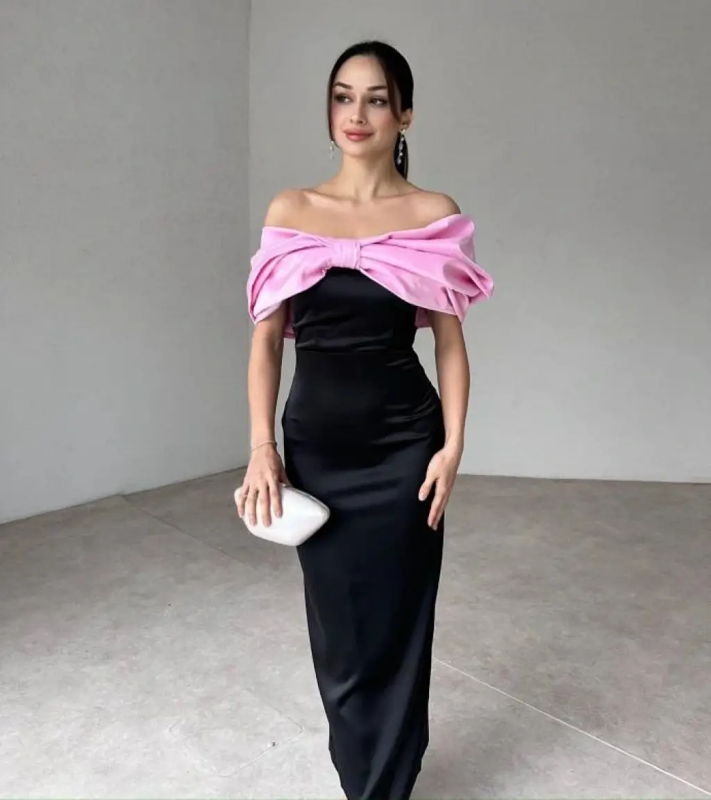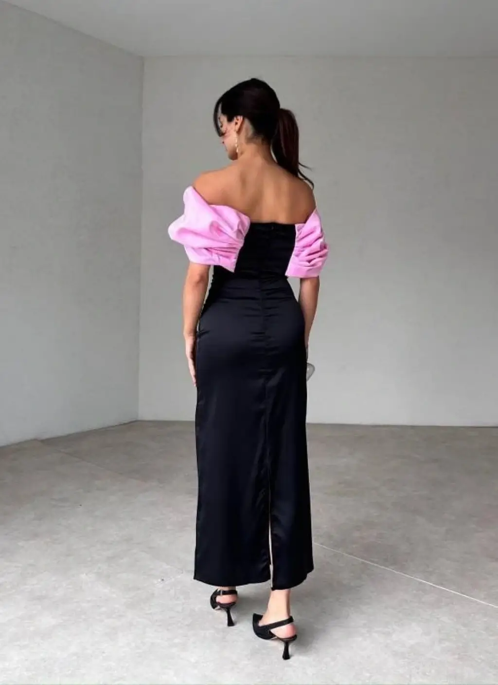 Kadın Omuzlardan Büzgülü Kayık Yaka Fırfırlı Janjan Krep Elbise