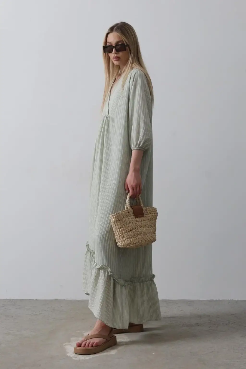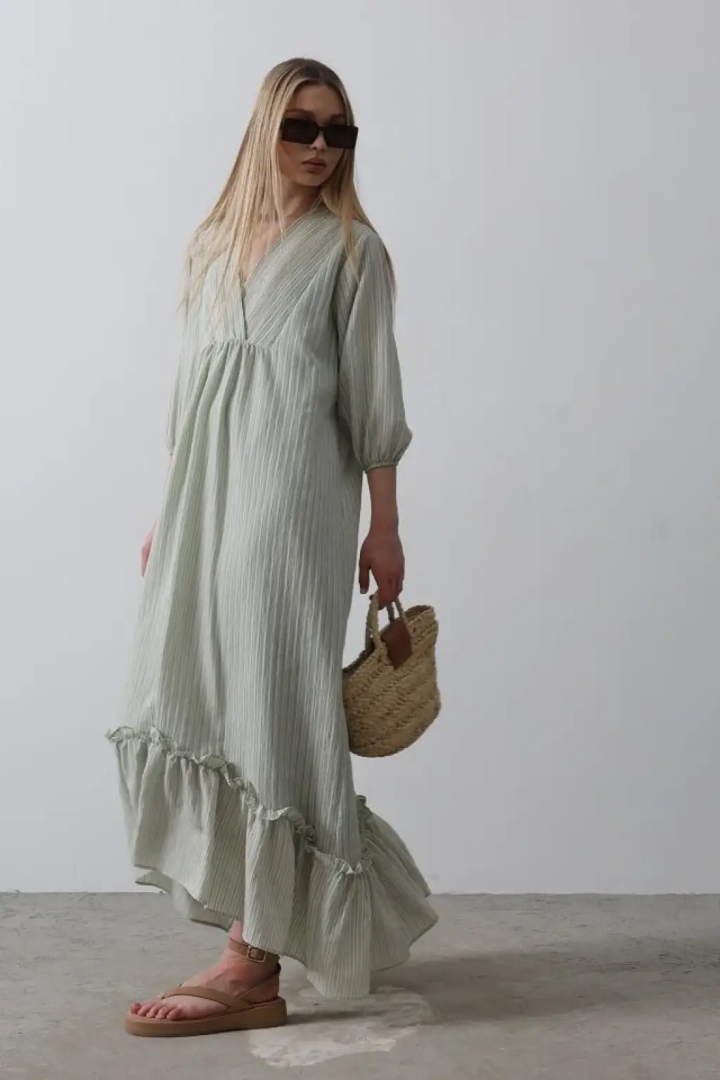 Çizgili Oversize V Yaka Elbise - Haki
