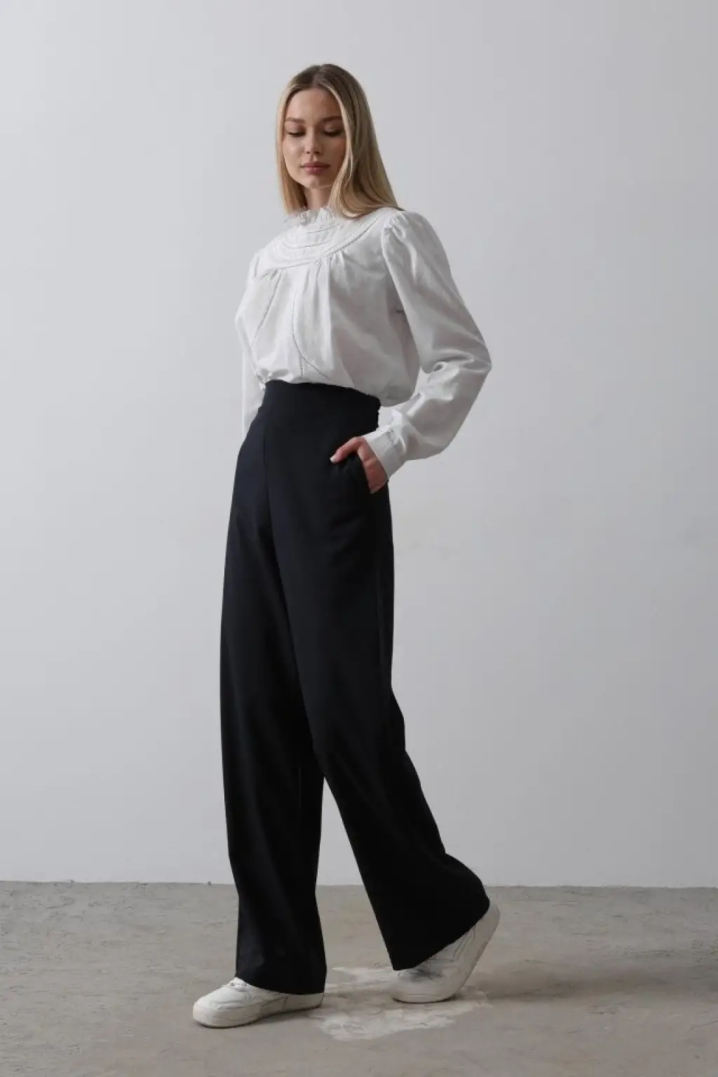 Kadın Yüksek Bel Geniş Paça Detaylı Cepli Ithal Krep Pantolon