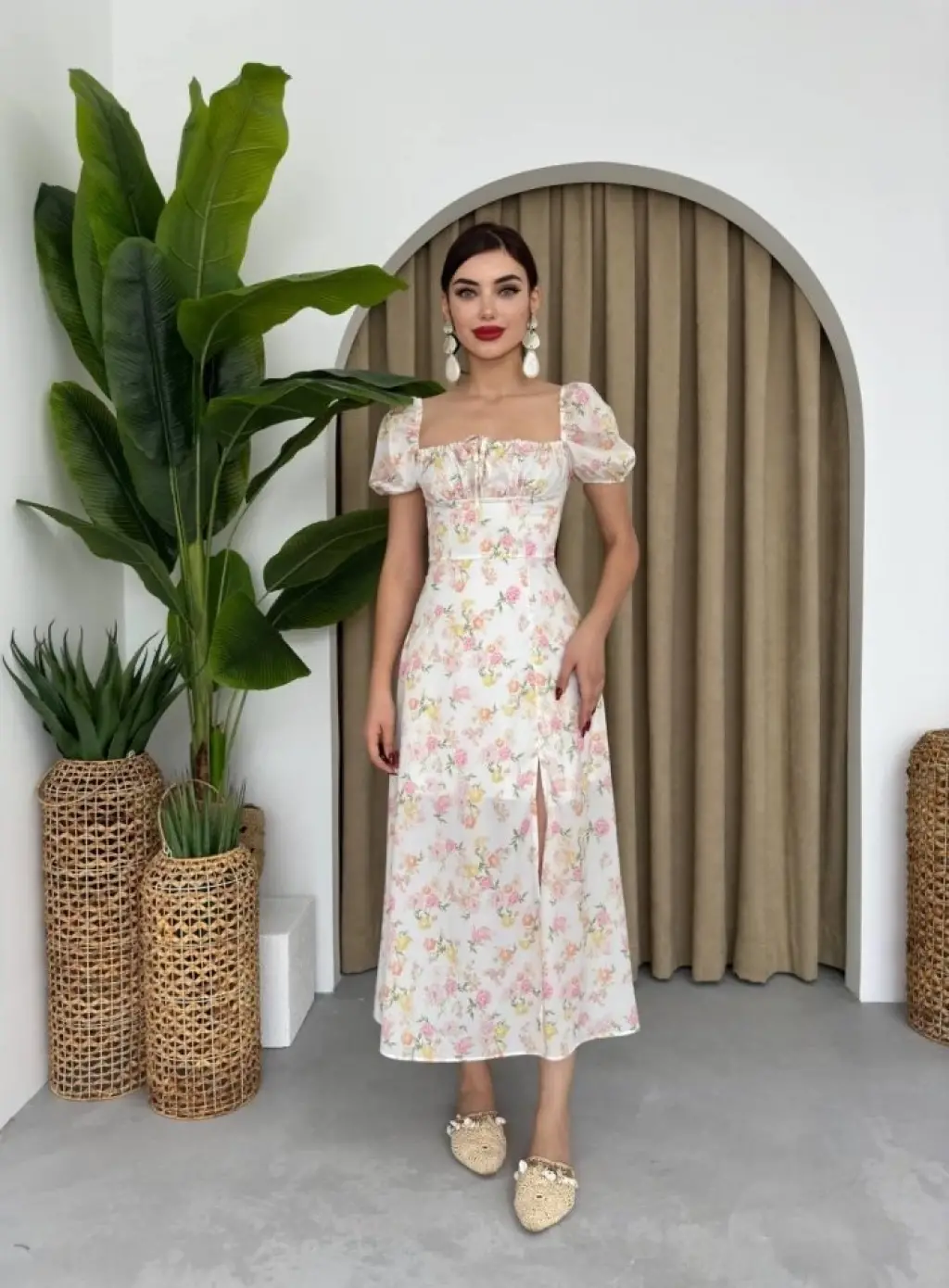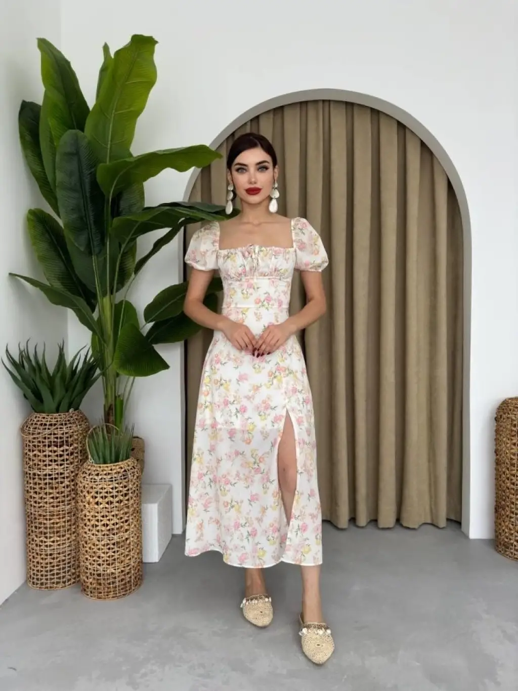 Kadın Kısa Kollu Balıkçı Yaka Derin Yırtmaç Detay Viskon Elbise