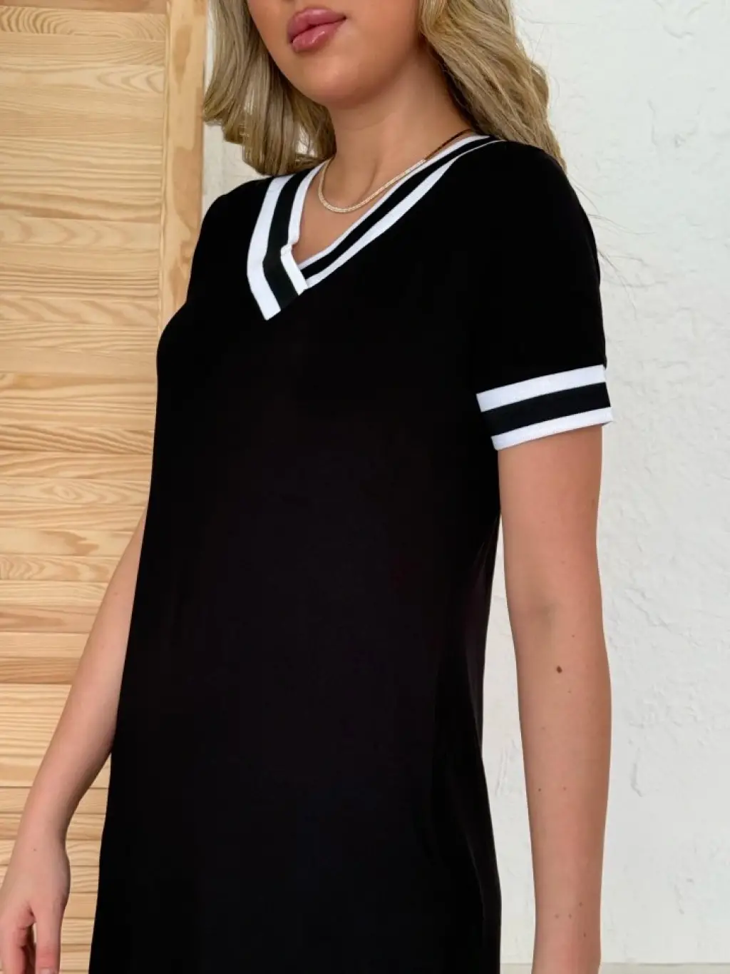 Kadın Kısa Kollu V Yaka Kol Ve Yaka Ribana Detay Midi Boy Viskon Elbise