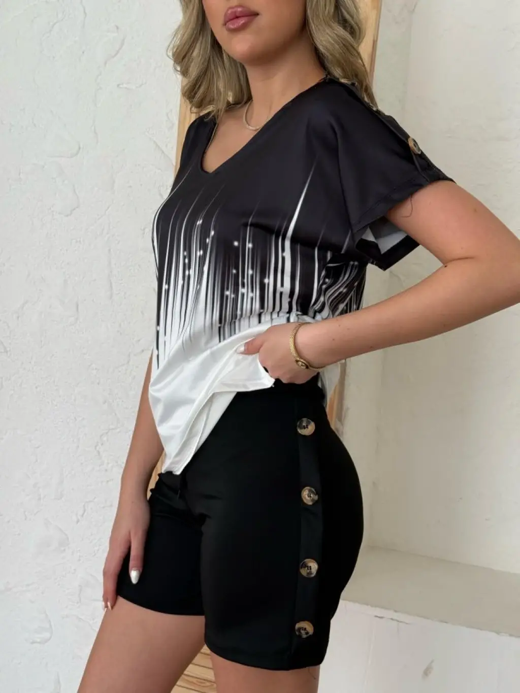 Kadın V Yaka Kısa Kol Kenarları Minik Yırtmaç Detaylı Dalgıç Bluz + Düğme Detaylı Dalgıç şort