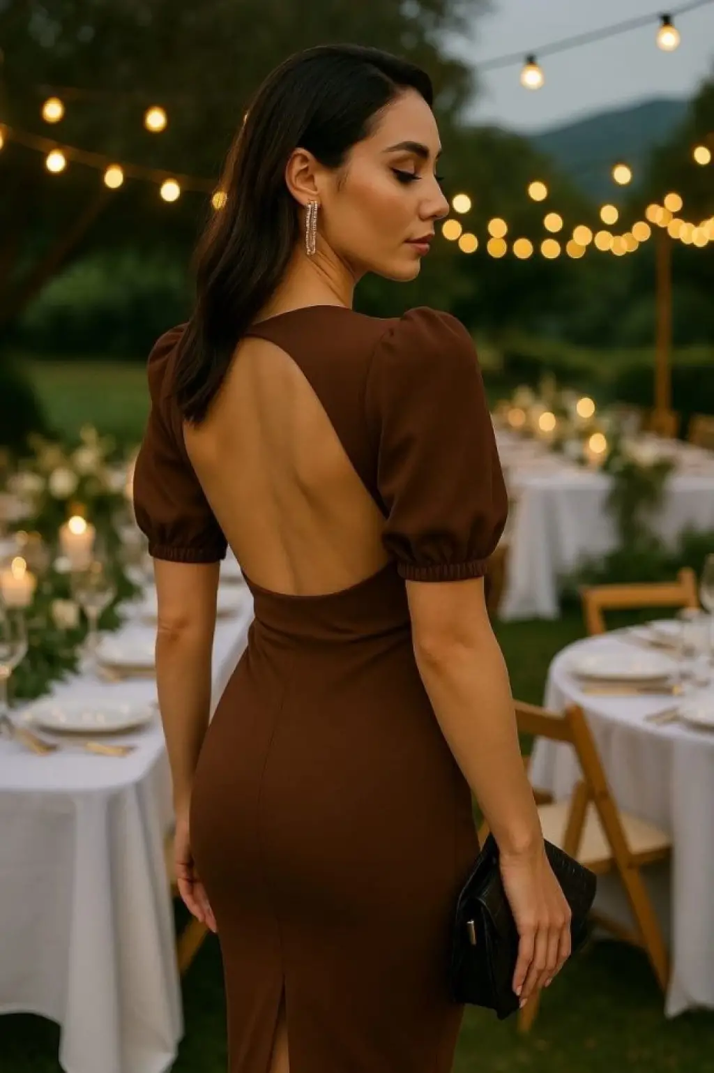 Kadın V Yaka Önü Düğmeli Sırt Pencere Dekolte Elbise