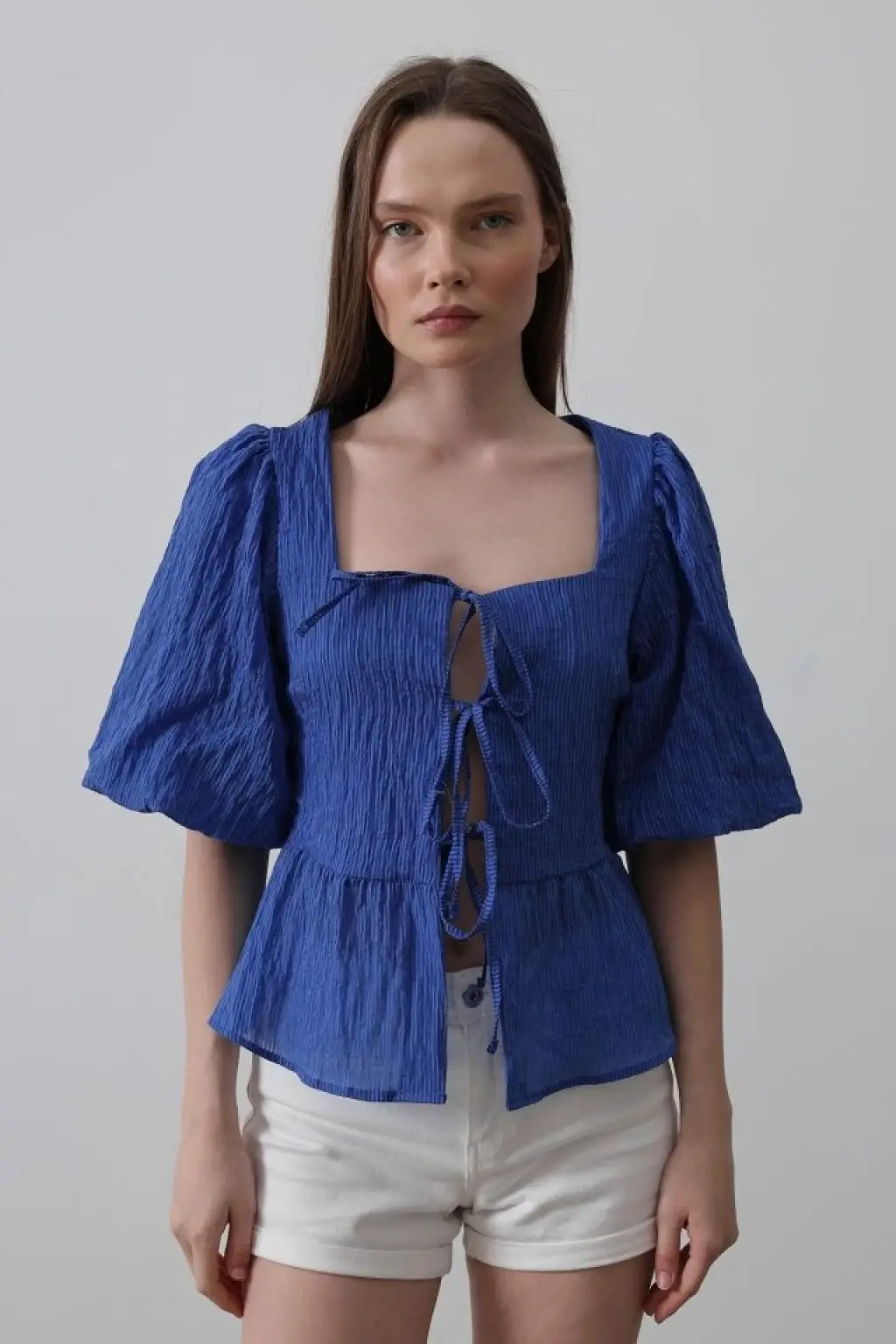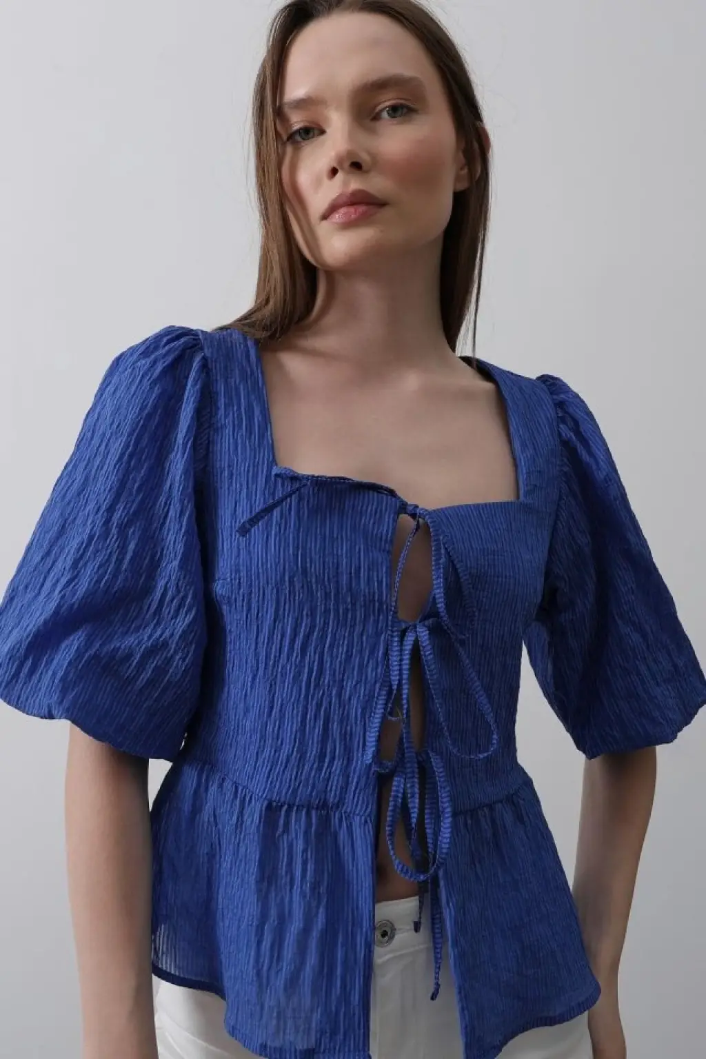 Büzgü Detaylı Kısa Kol Sandy Bluz 945 - Saks