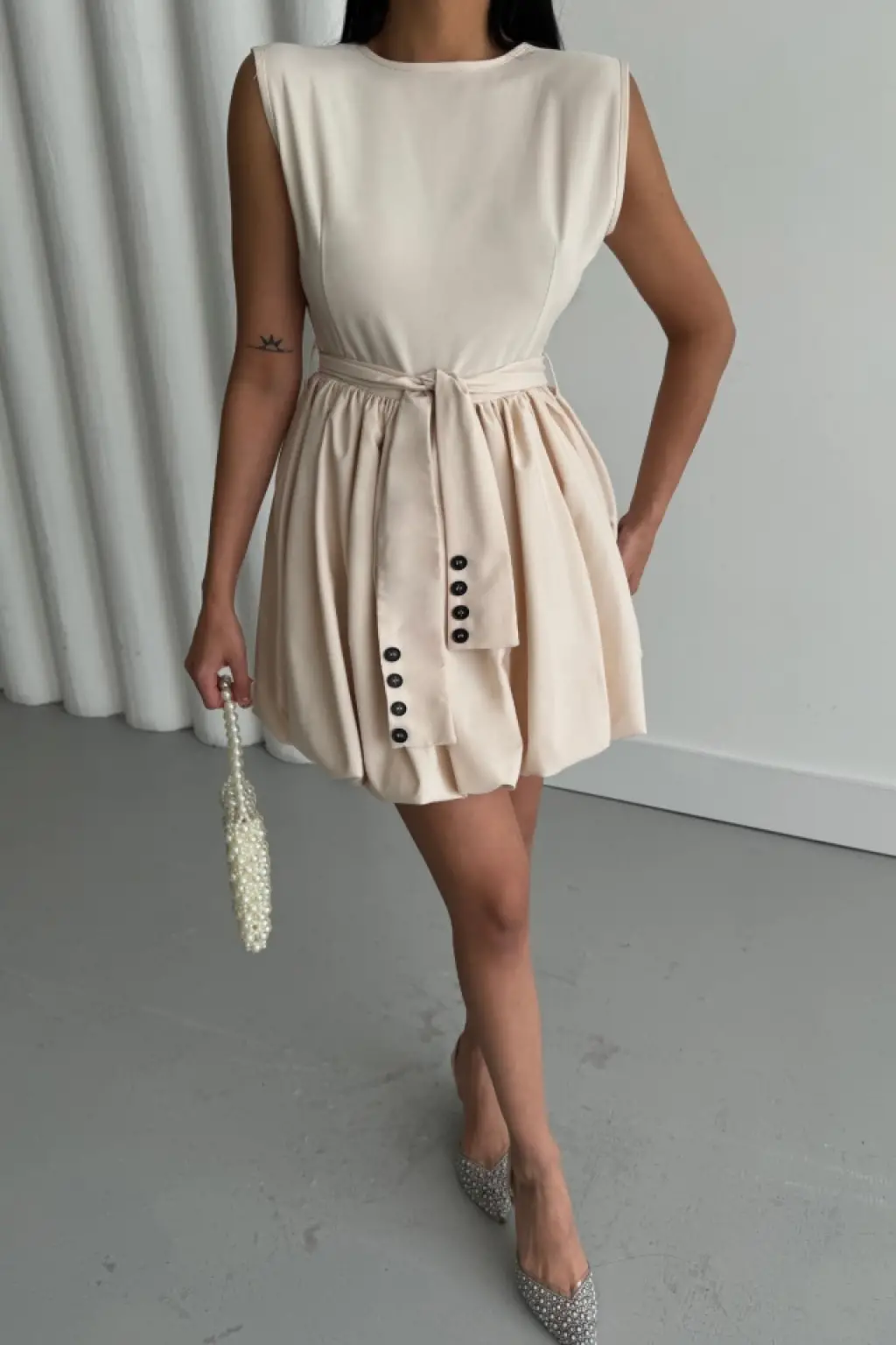 Omarı Şık Balon Etekli Bej Kısa Elbise