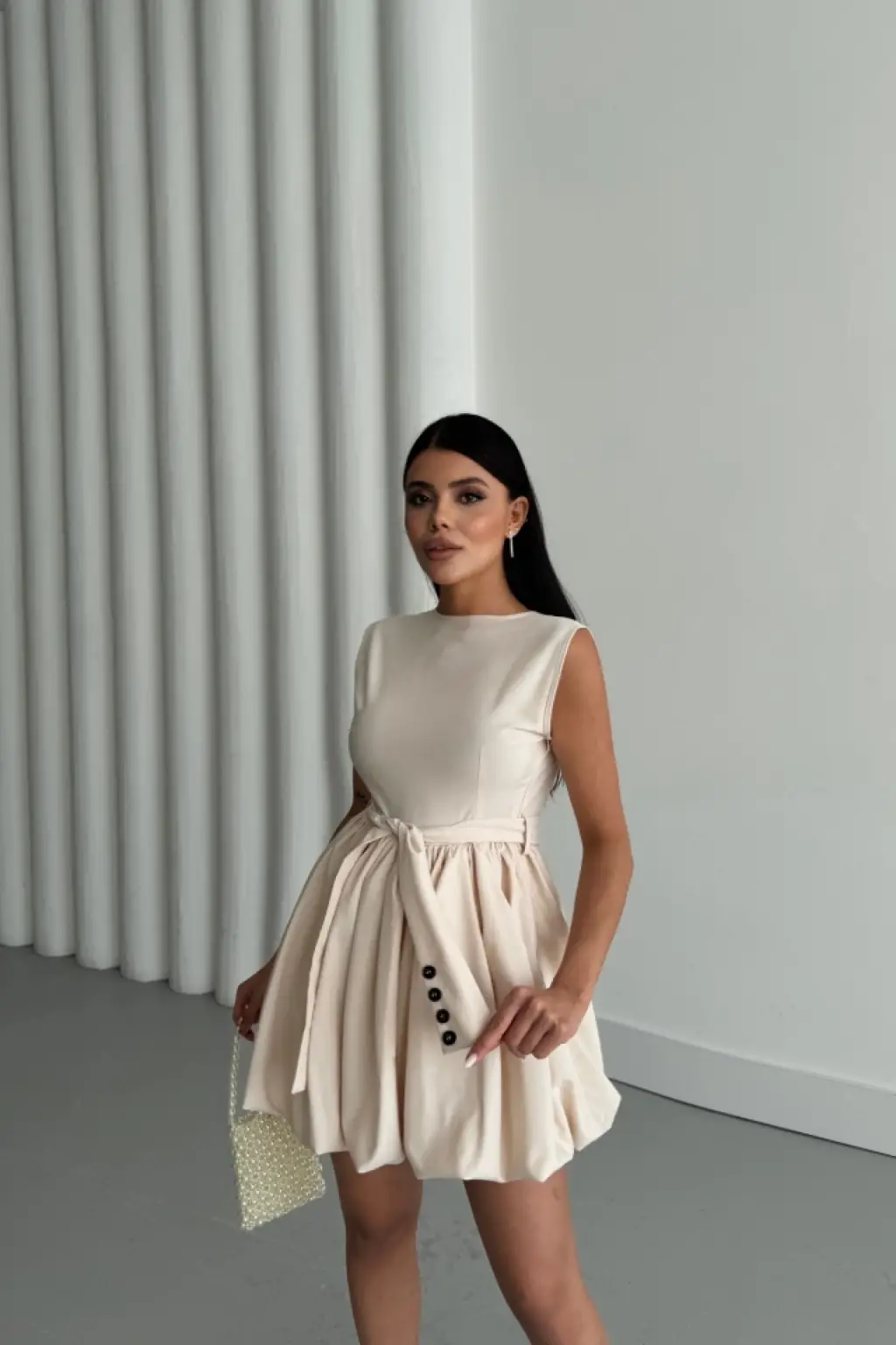BALON ETEKLİ TASARIM KISA ELBİSE - Bej