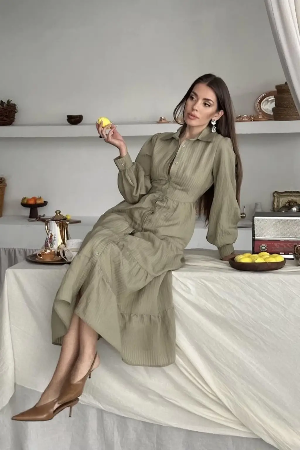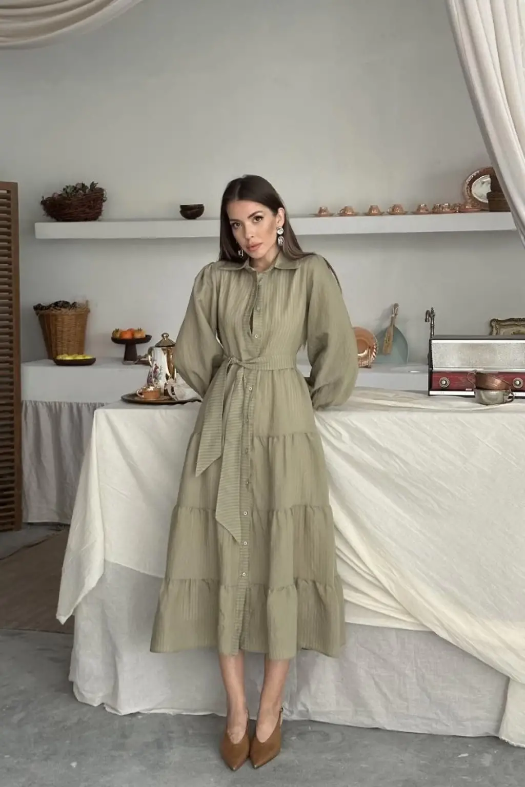 Kadın Uzun Kollu Kare Yakalı Midi şardonlu Kaşkorse Elbise