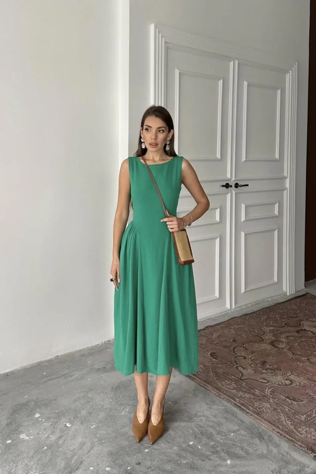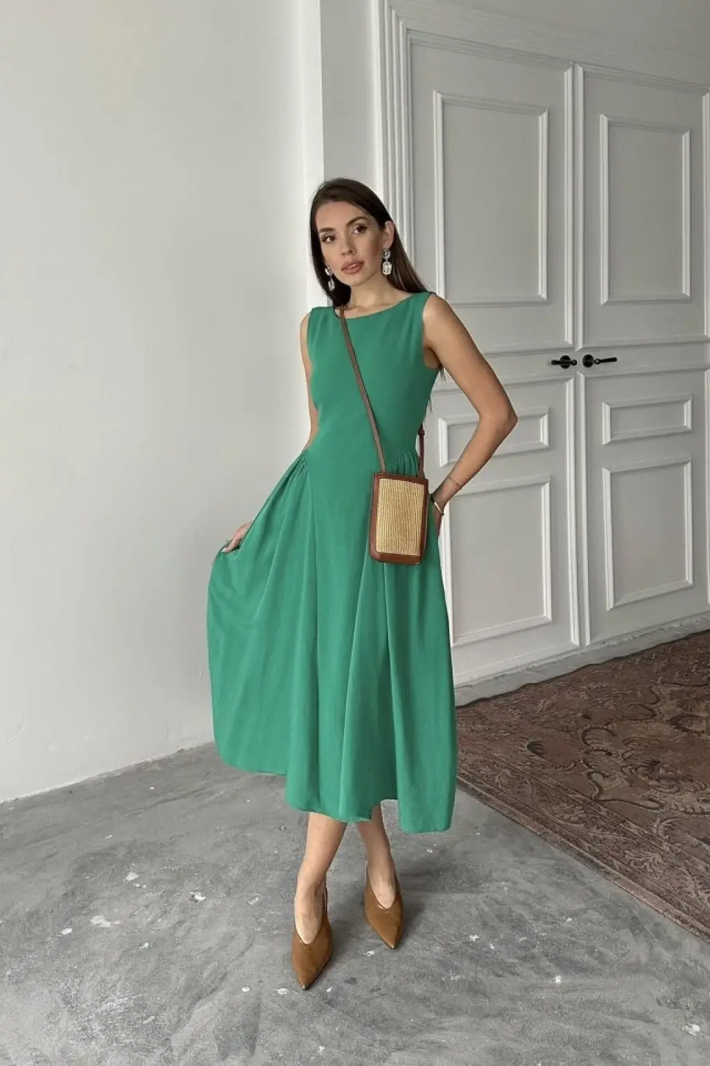 Yeşil Yanları Büzgülü Midi Boy Keten Elbise