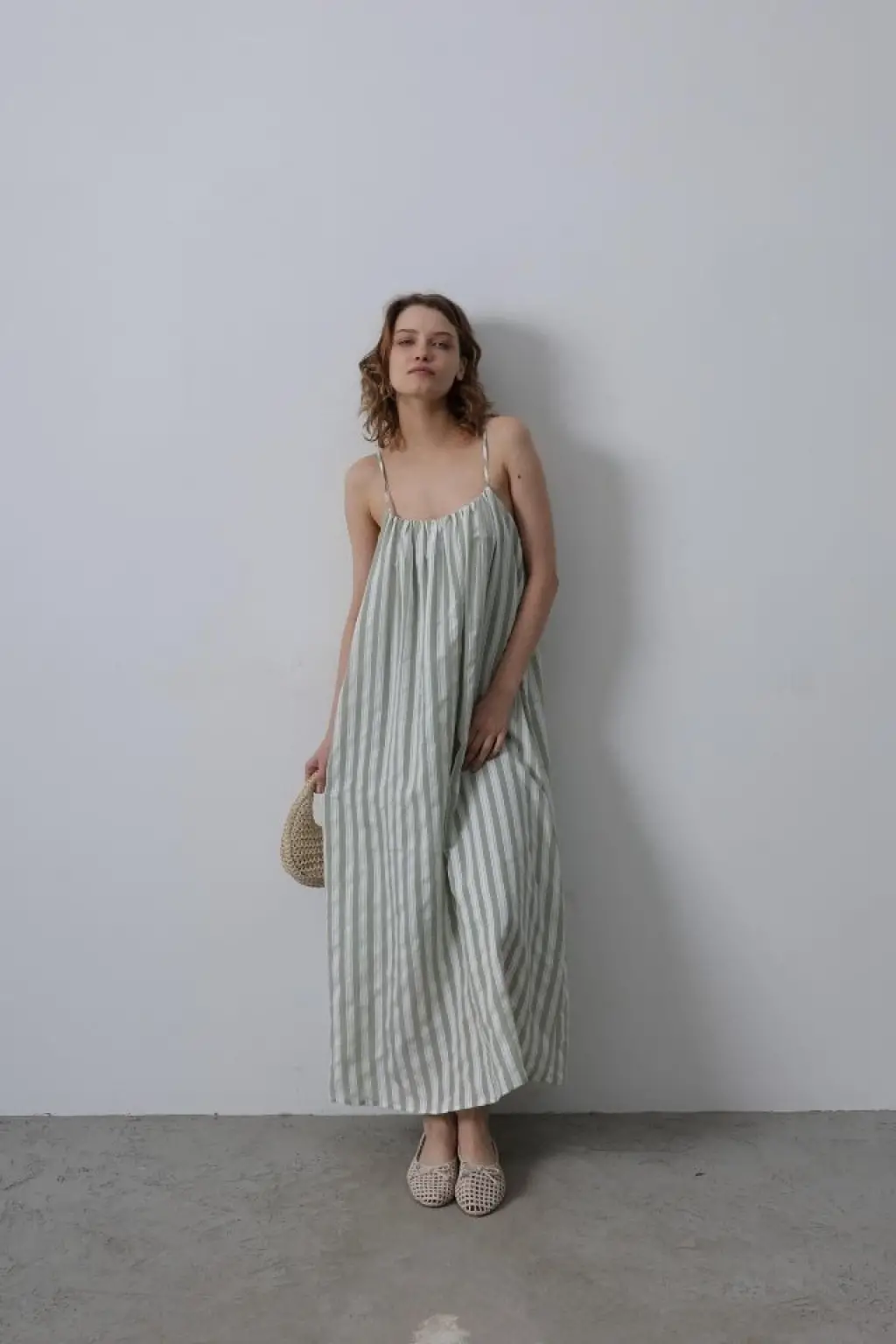 Askılı Çizgi Desen Elbise - Haki