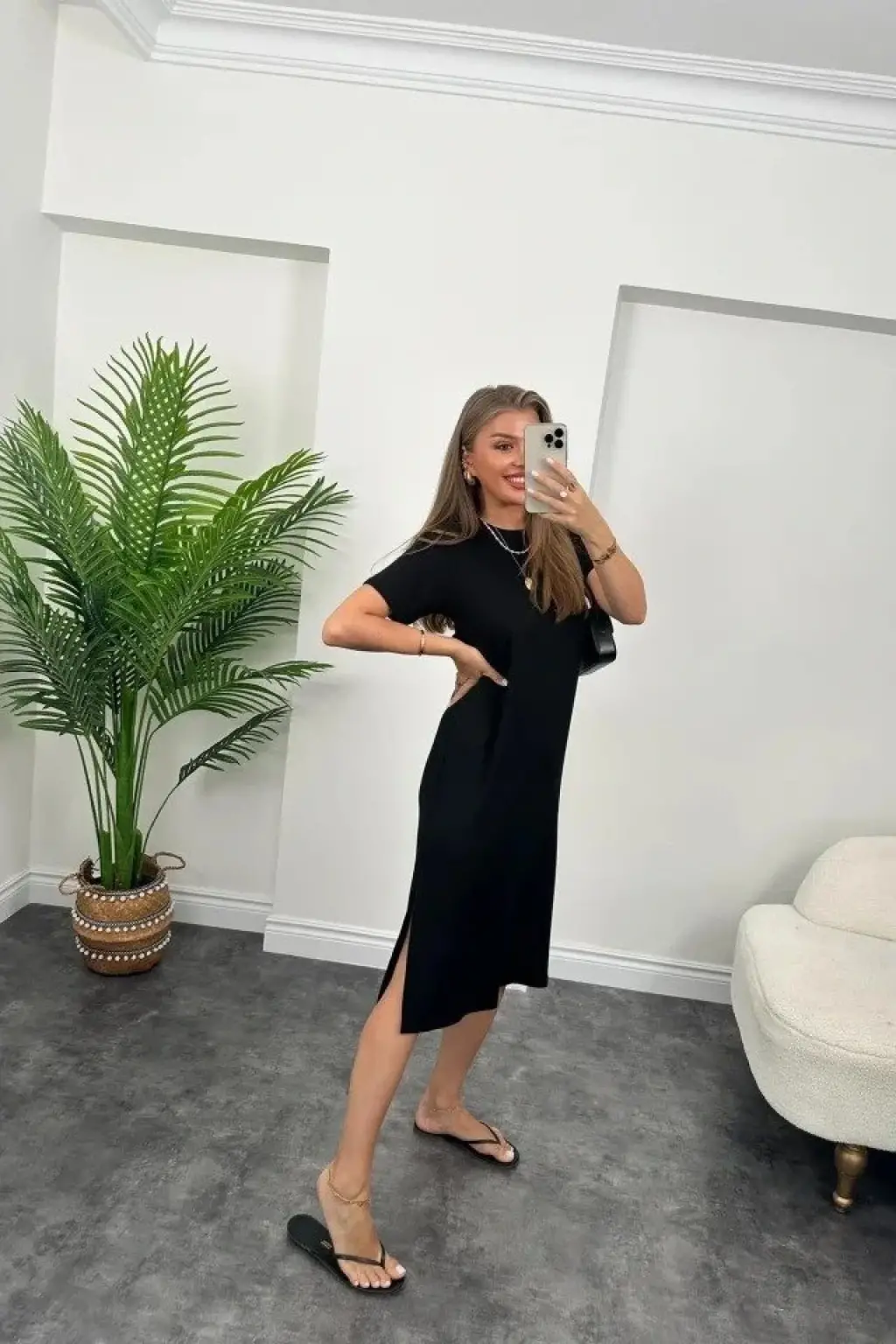 Kadın Kısa Kollu Yırtmaç Detaylı Salaş Viskon Elbise