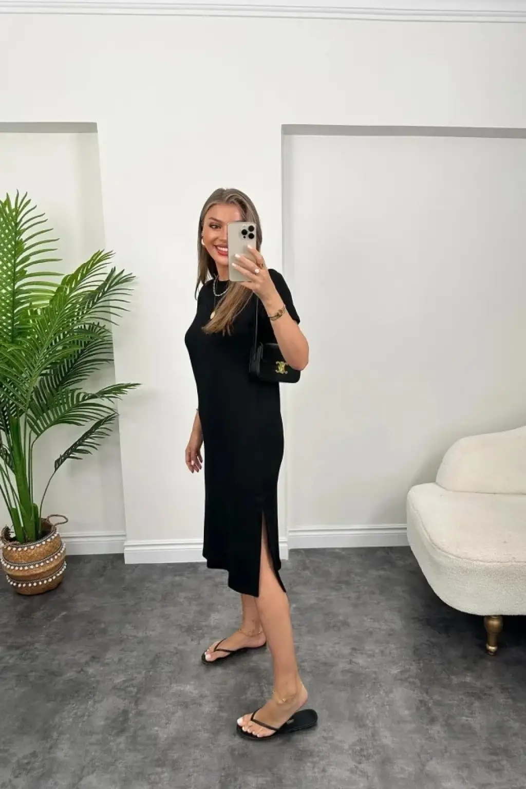 Kadın Uzun Kollu V Yakalı Yandan Yırtmaçlı Iki Iplik Midi Elbise