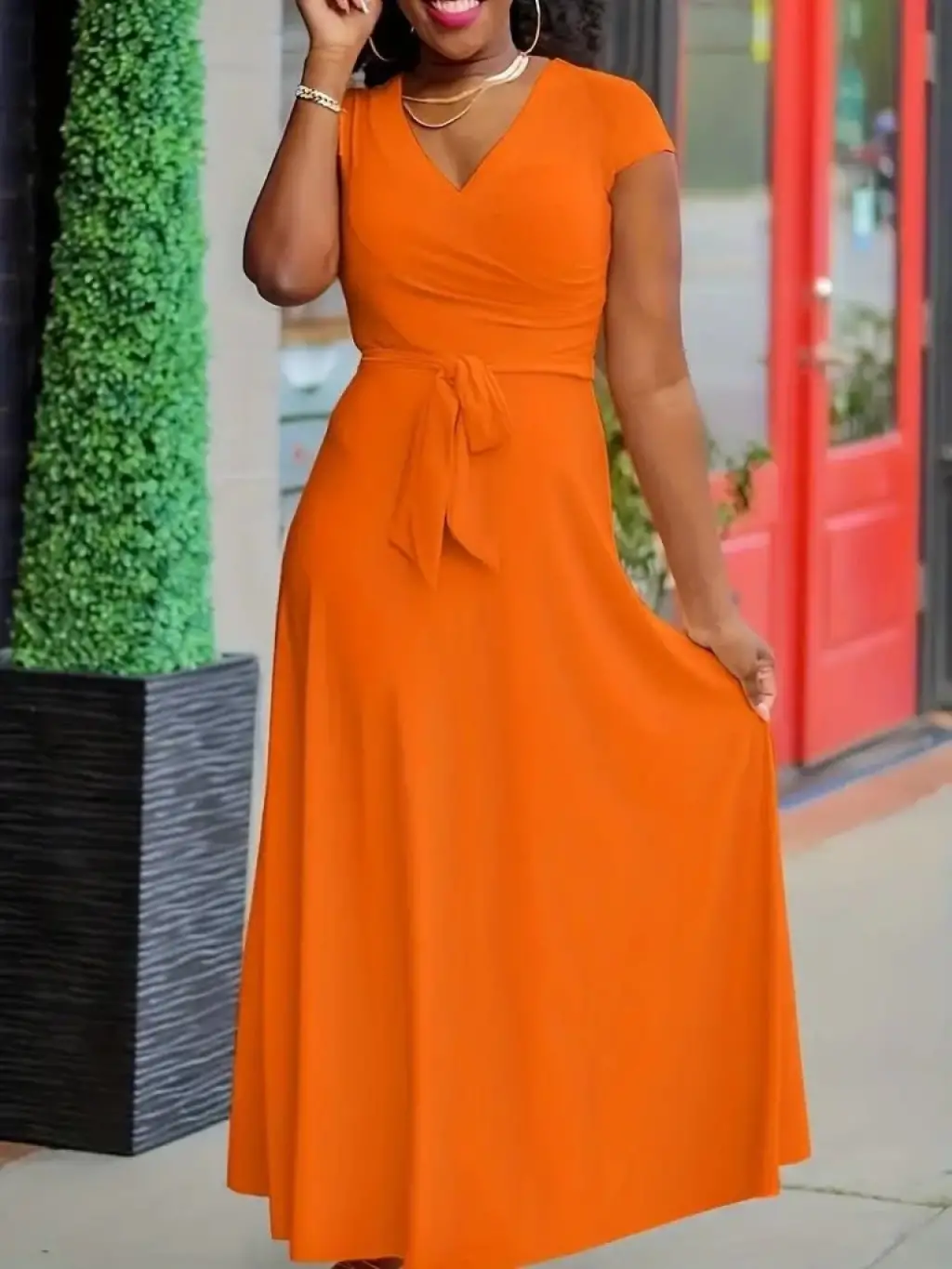 Kadın Kısa Kollu V Yakalı Belden Kuşaklı Maksi Boy Viskon Elbise
