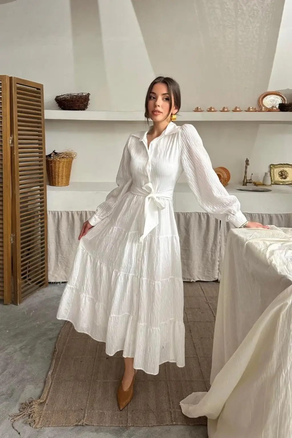 Ekru Çizgi Desenli Uzun Elbise
