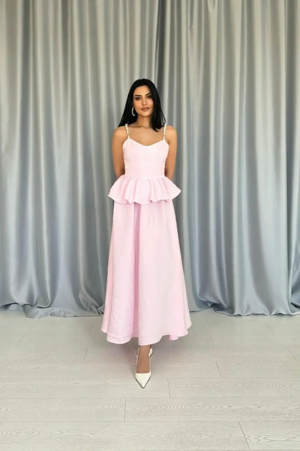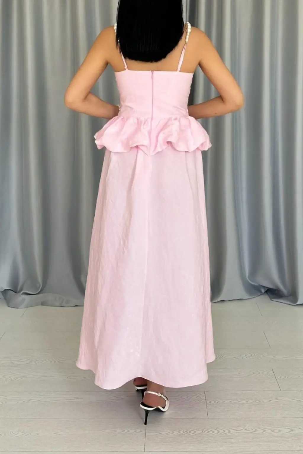 Pembe Beli Büzgülü İnci Askılı Uzun Elbise