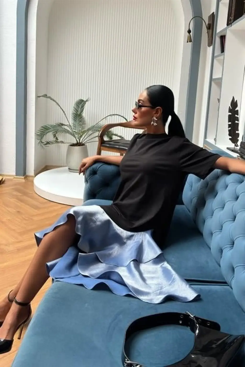 Kadın Kısa Kollu Madonna Yaka önü Kısa Arkası Uzun Ithal Krep Elbise