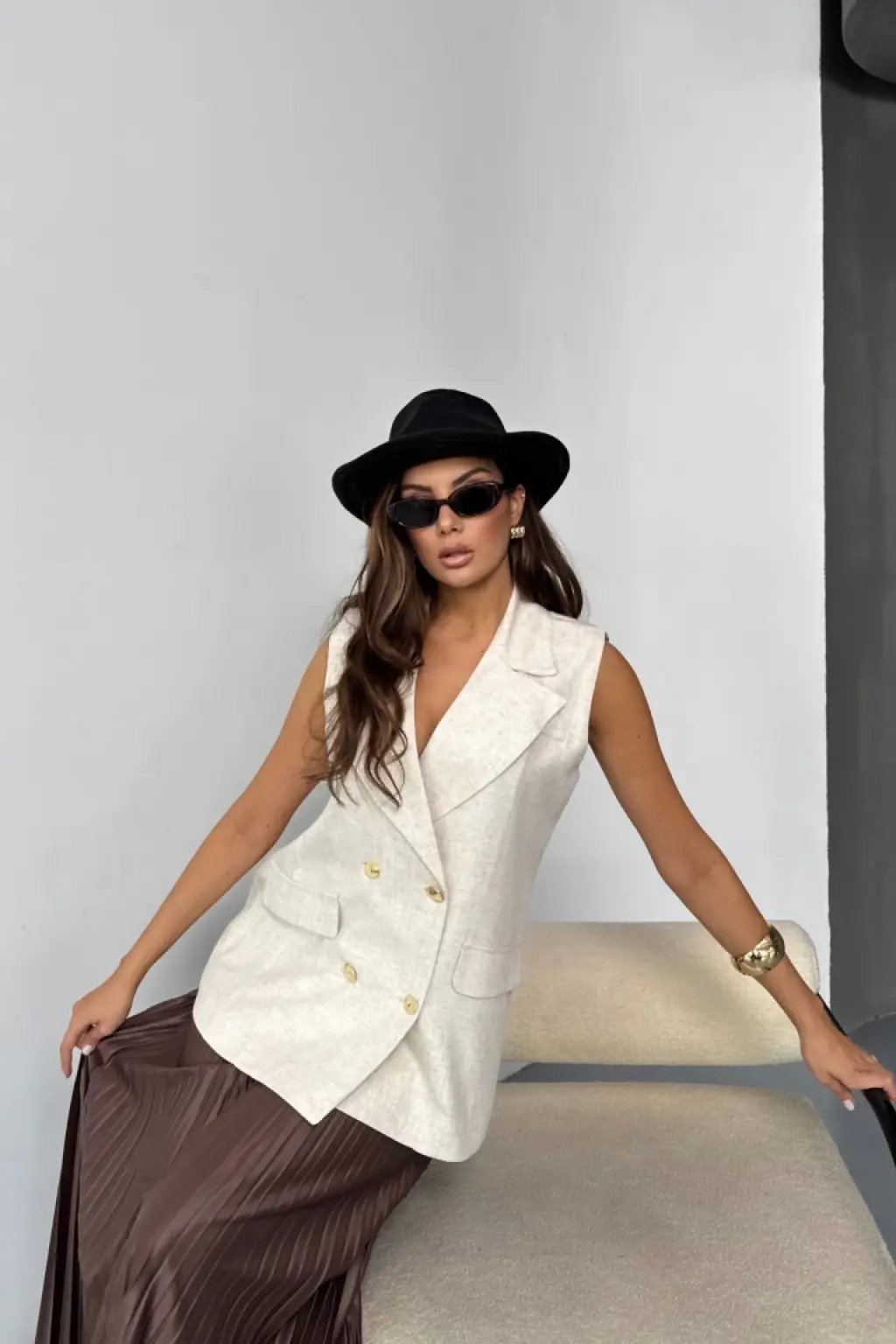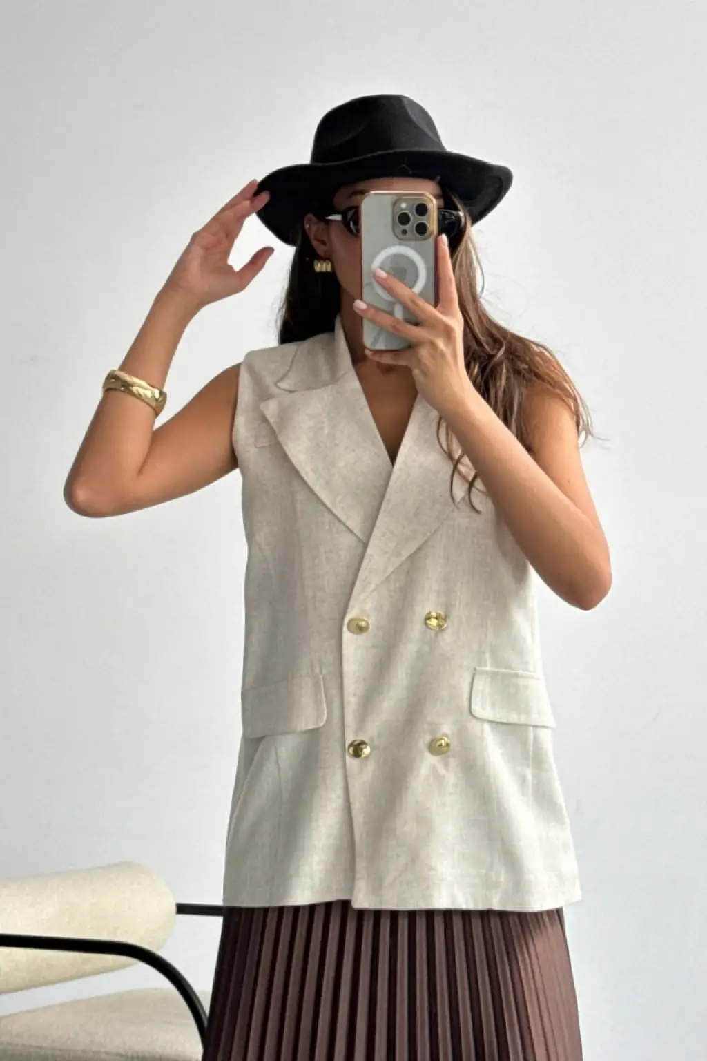 GOLD DÜĞMELİ KETEN YELEK - Ham