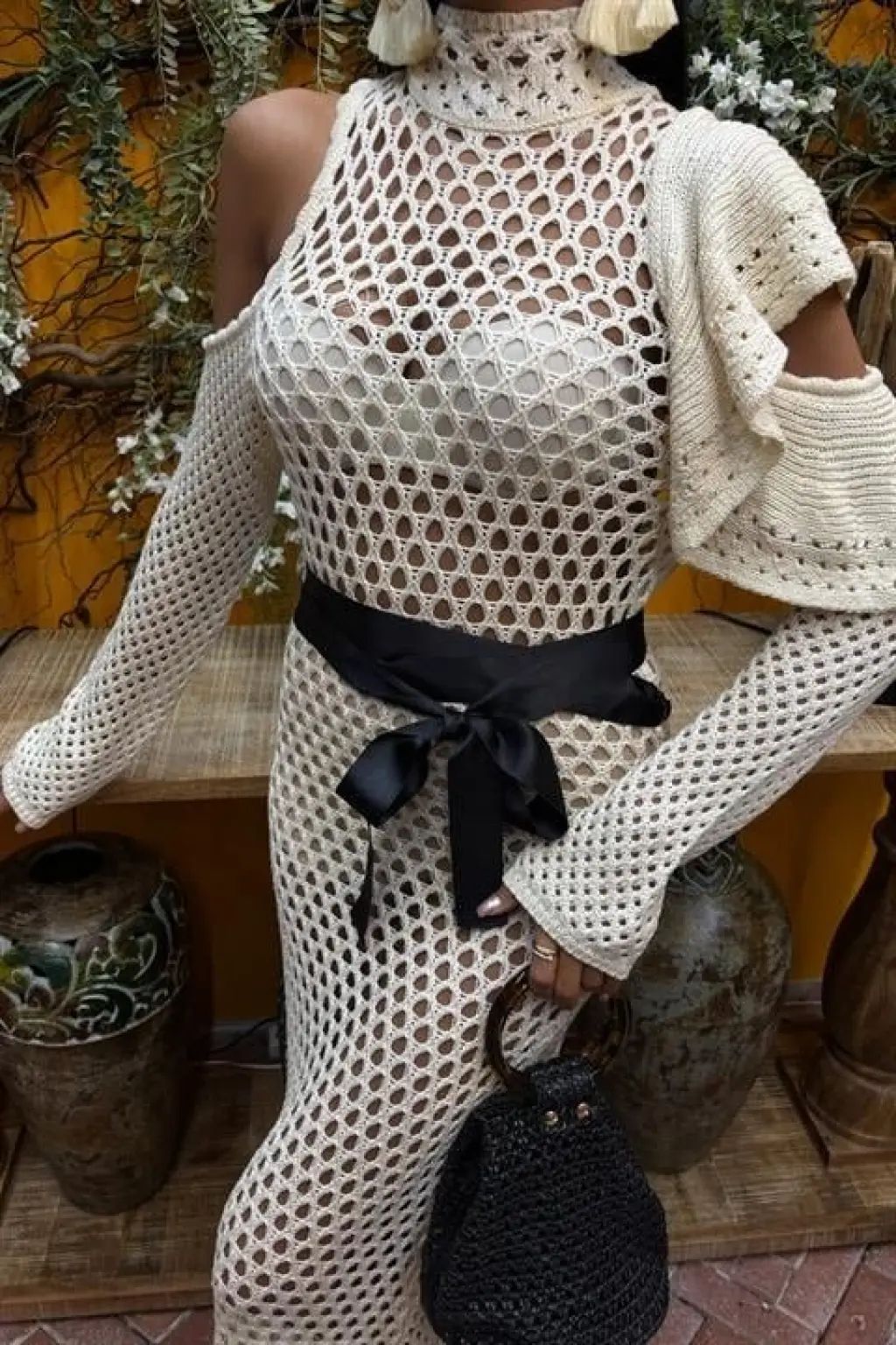 Saten Kuşaklı Ajurlu Triko Elbise 2847