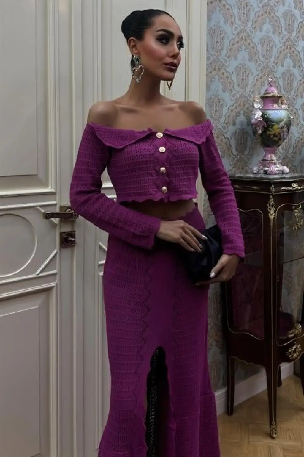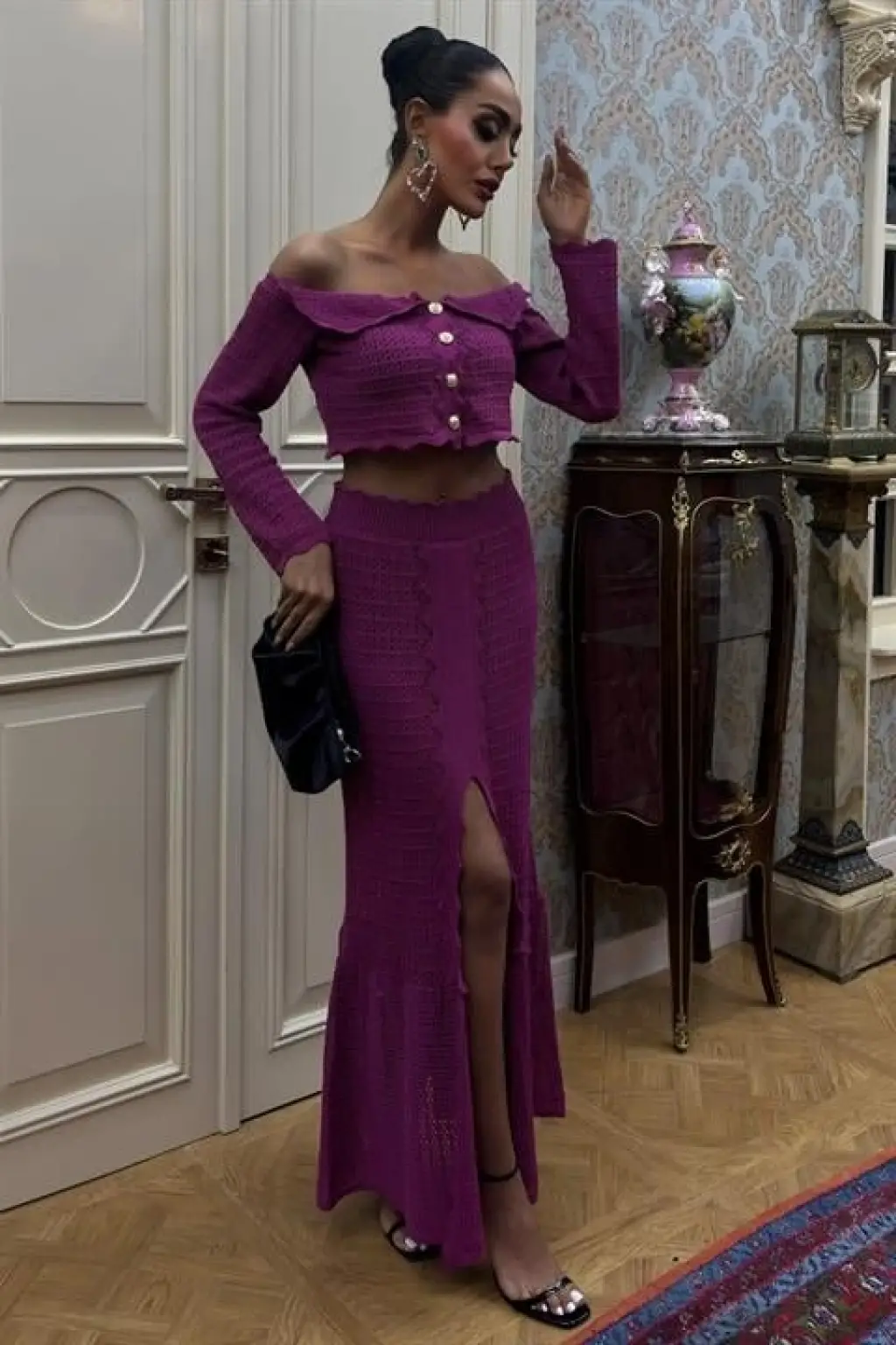 Yaka Derin Yırtmaç Etekli Şık Triko Takım Kadın Giyim