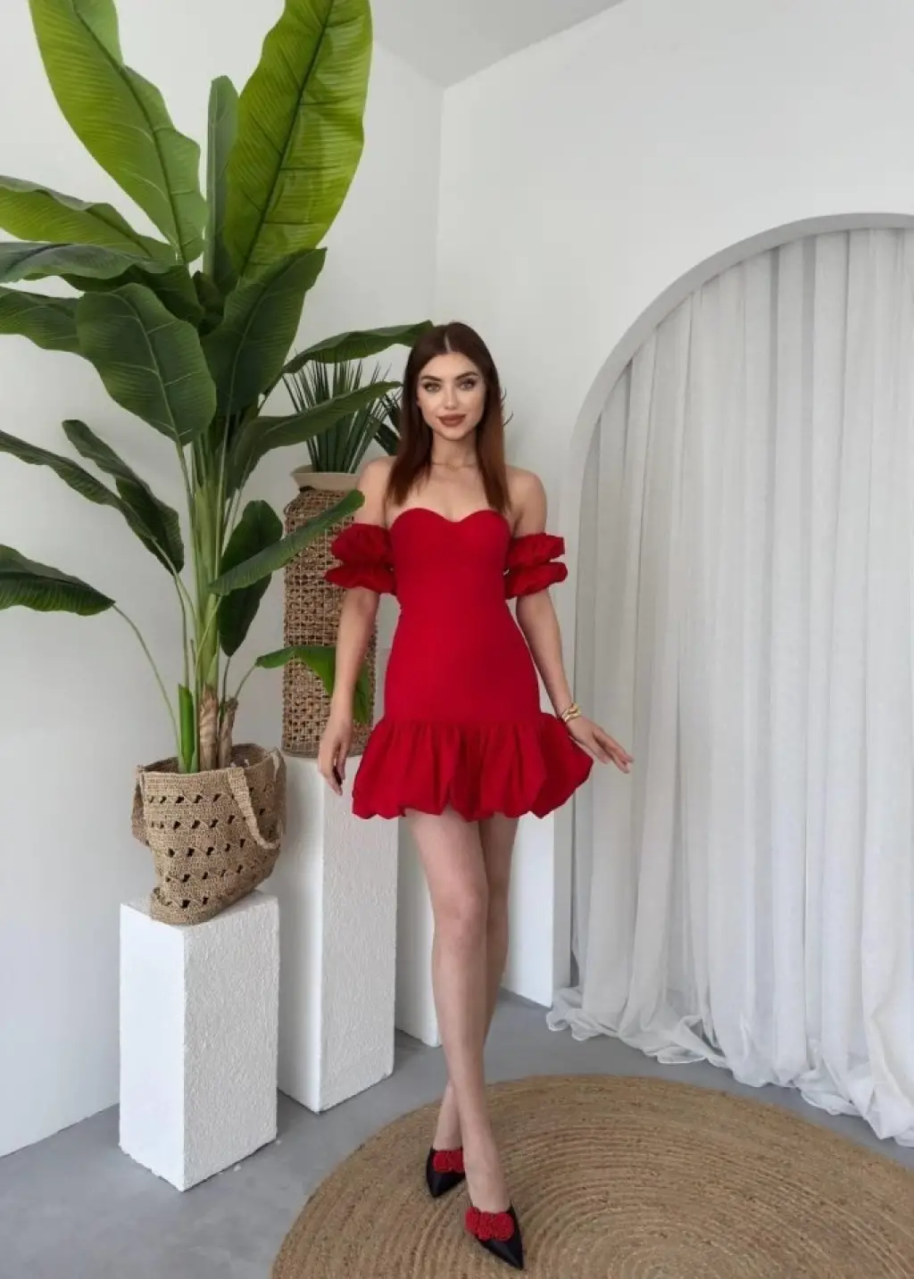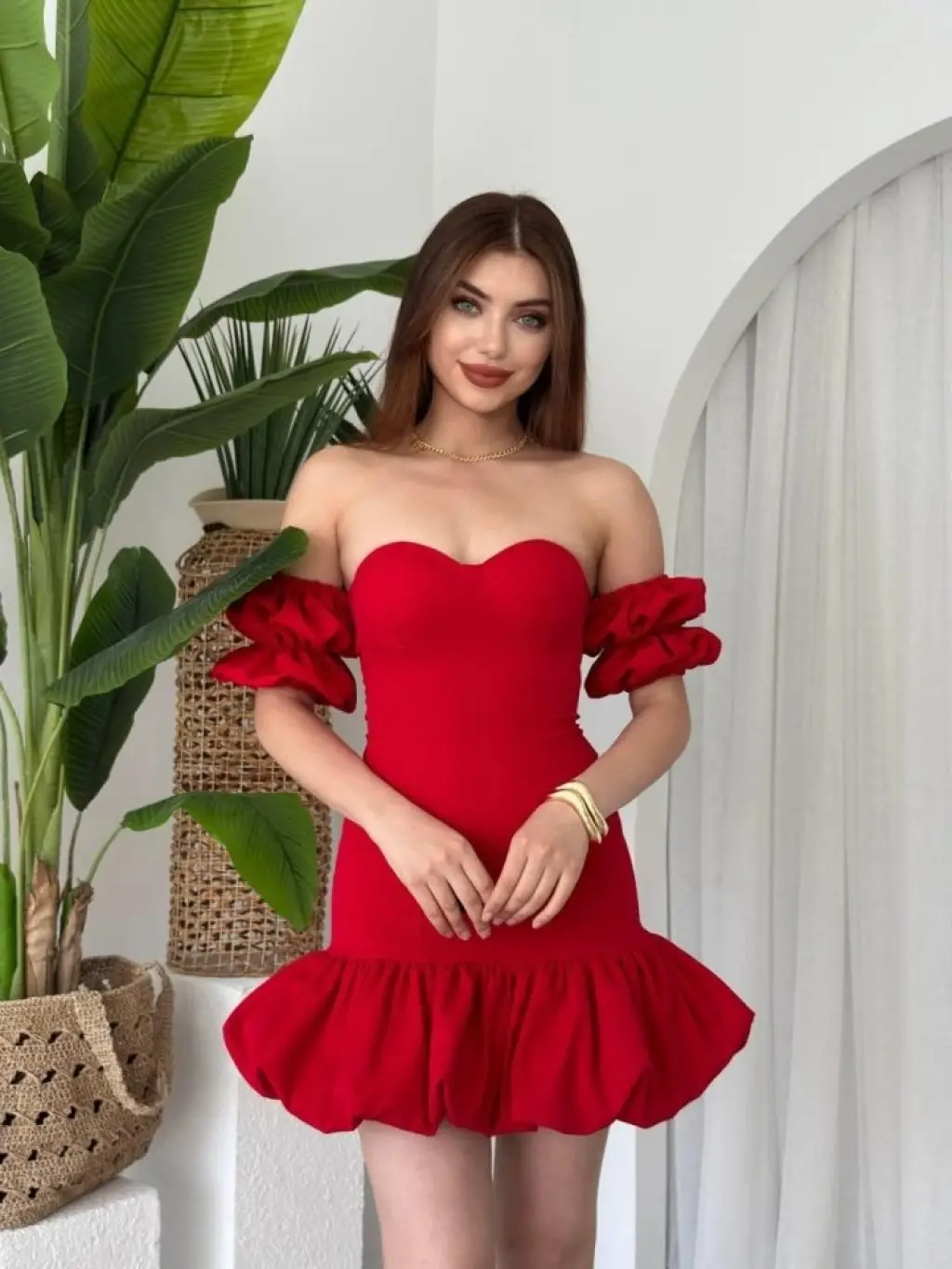 Kadın Kolsuz Omzu Volanlı Bisiklet Yaka Kaşkorse Mini Elbise