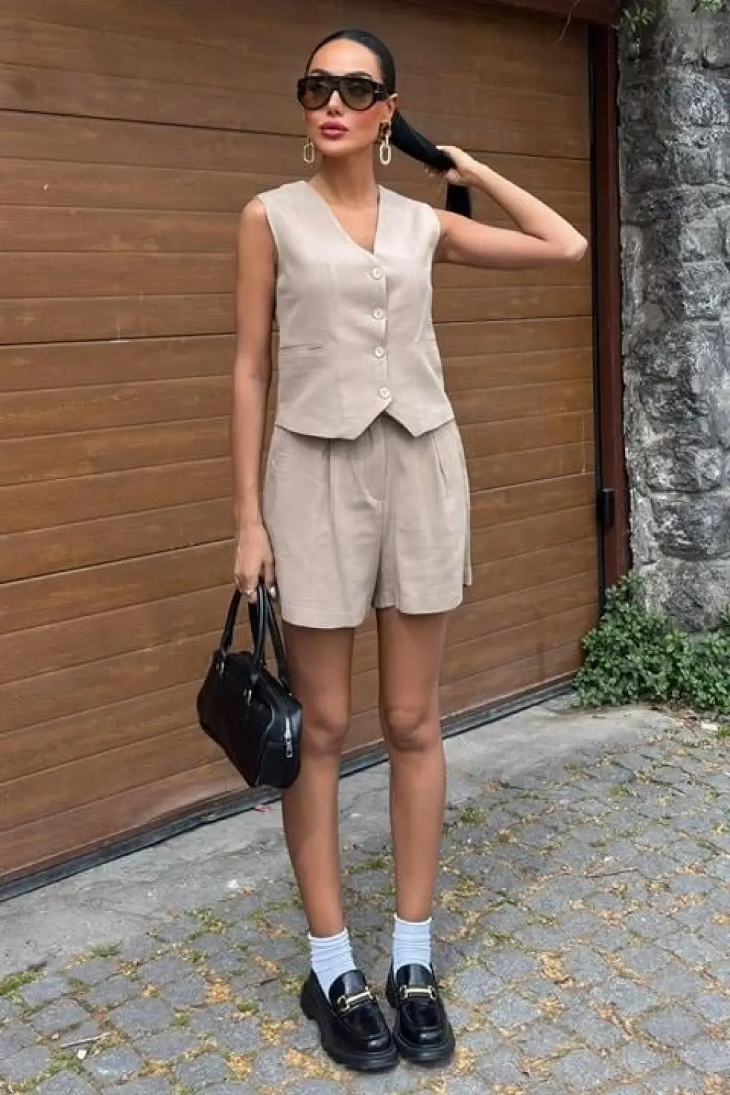 Yelek Şort Flamlı Keten Takım 10133-17
