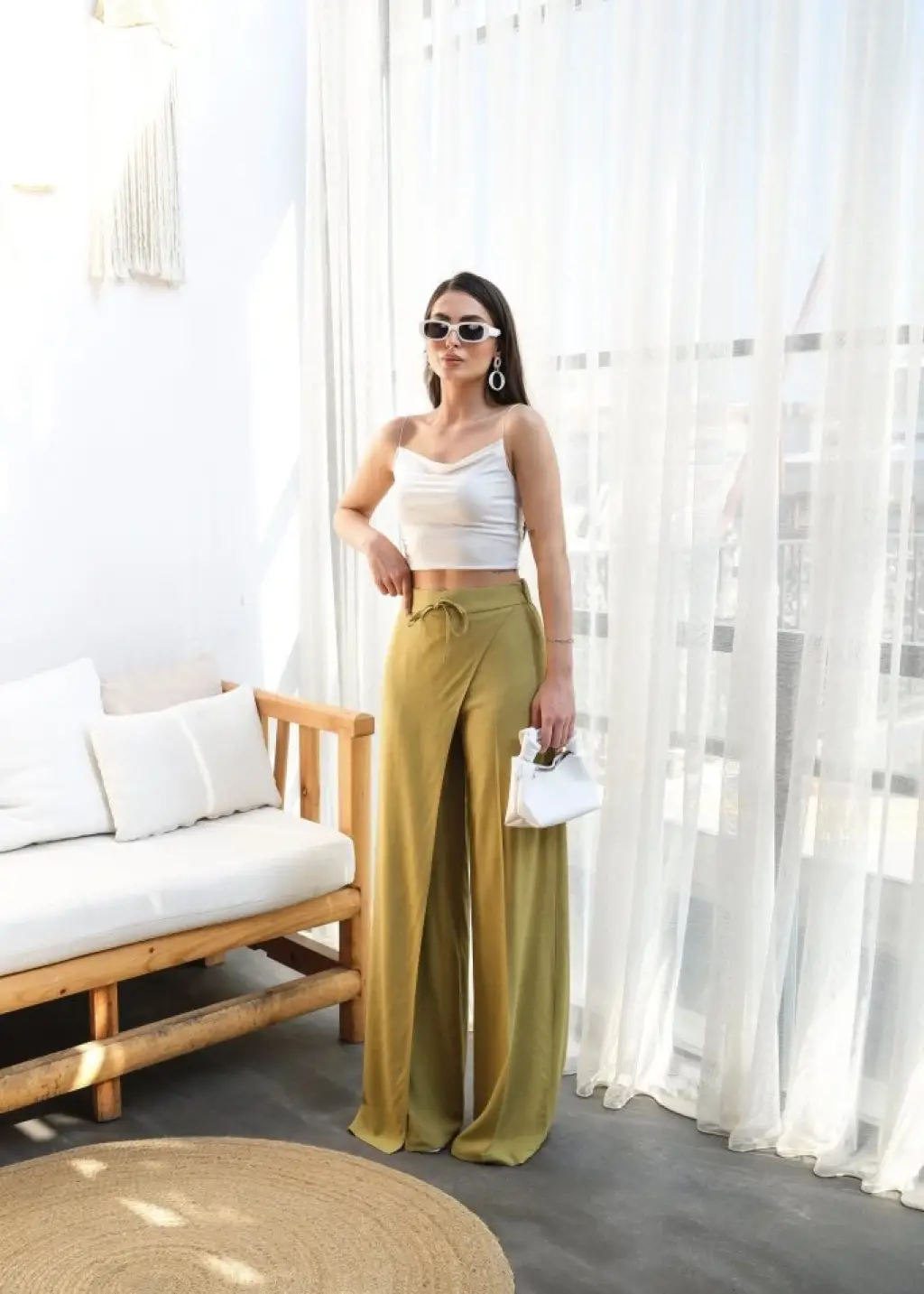 Keten Önü Çapraz Parçali Lasti̇kli̇ Ve Bağcikli Geni̇ş Paça Pantolon