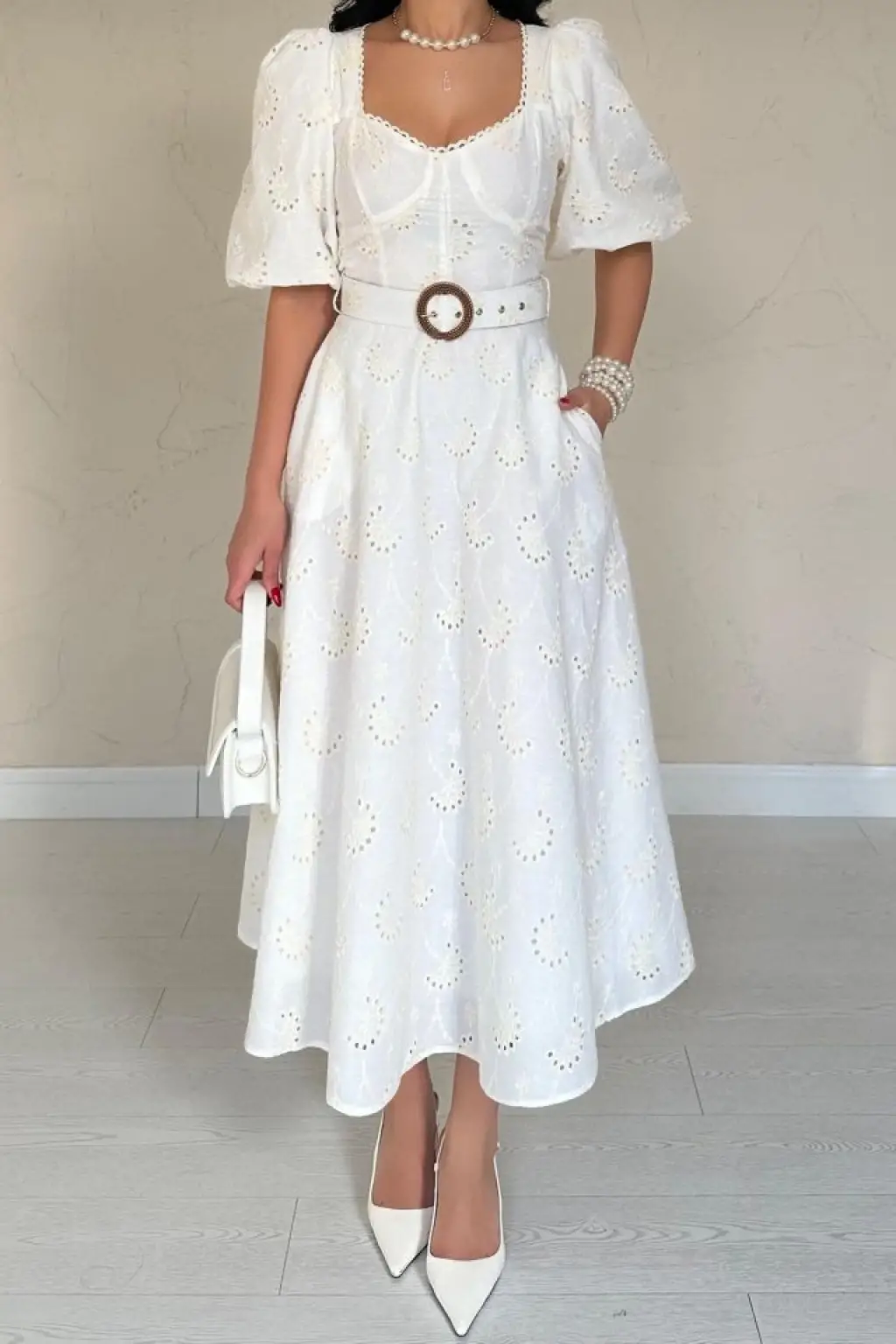 Ekru Göğüs Kup Detaylı Kemerli Brode Elbise