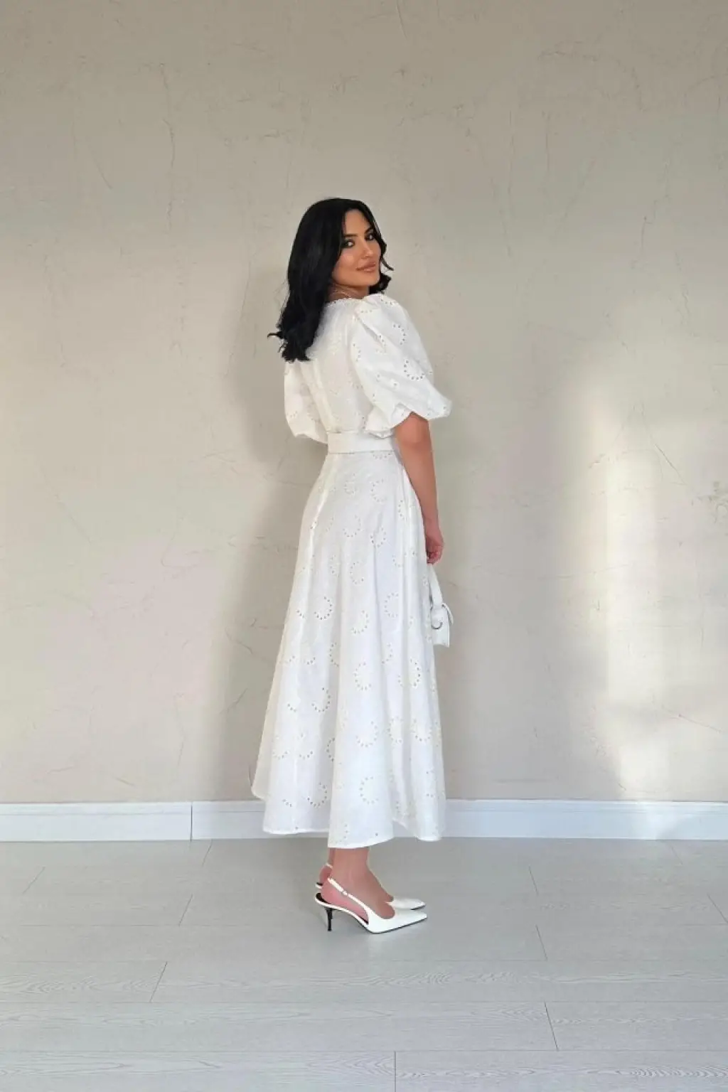 Kadın Kruvaze Yaka Balon Kol Midi Boy Elbise