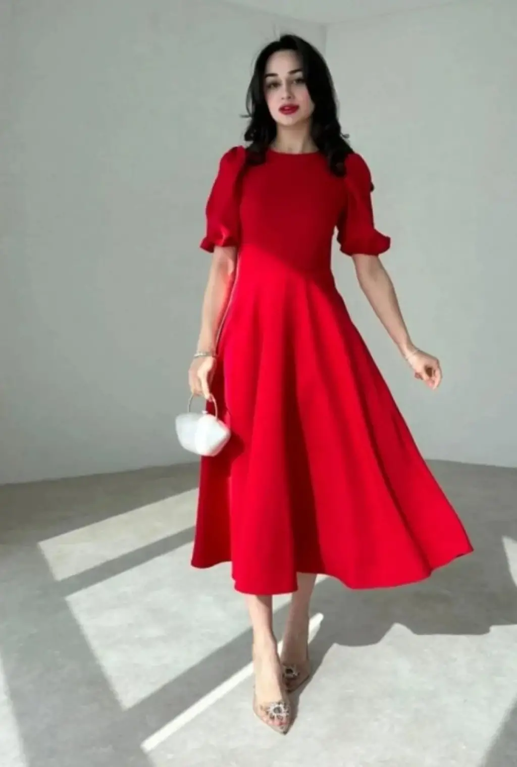 Kadın Kısa Balon Kollu Bisiklet Yaka Geniş Kesim Janjan Krep Elbise