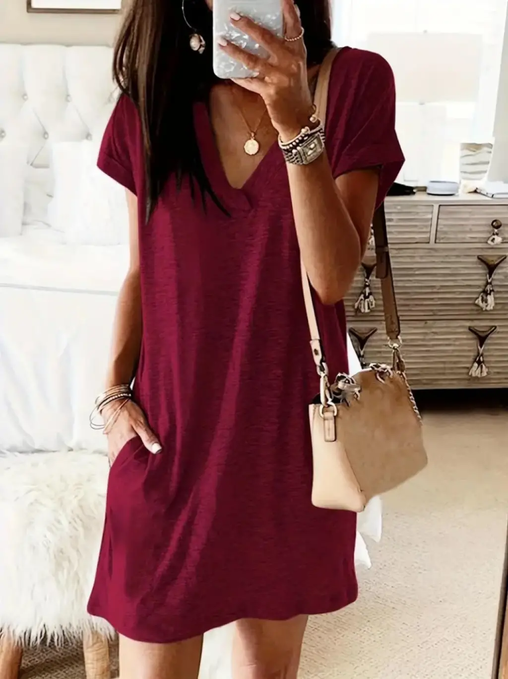 Kadın Kısa Kollu V Yakalı Cepli Kısa Viskon Elbise