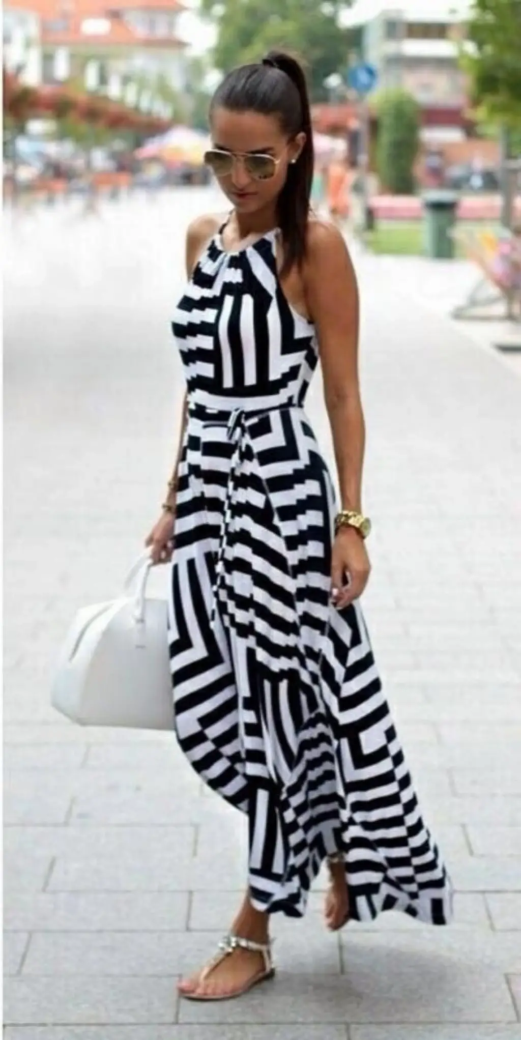 Kadın Askılı Belden Bağlamalı Geometrik Desen Krep Elbise
