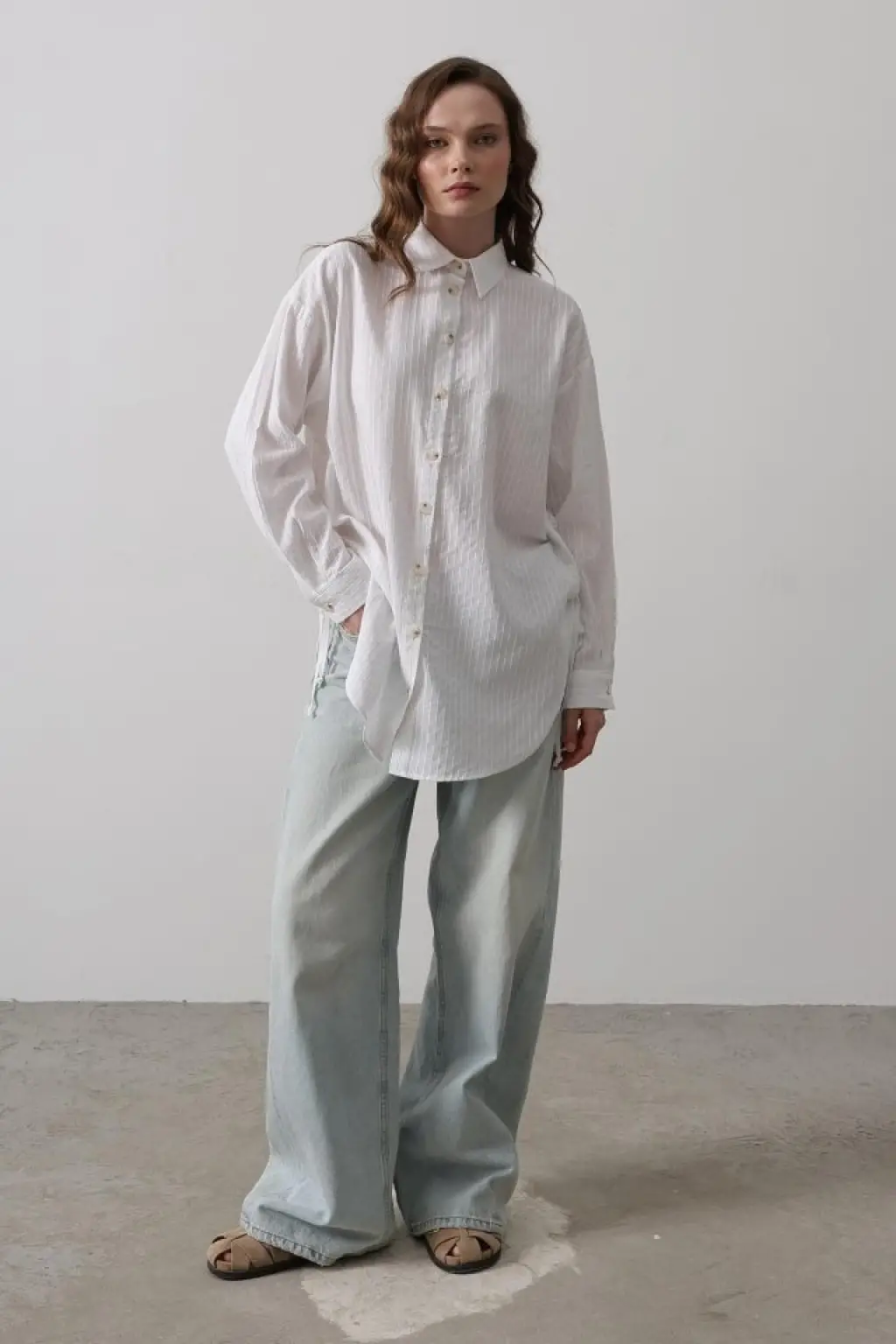 Çizgili Oversize Gömlek 20293 - Kahverengi