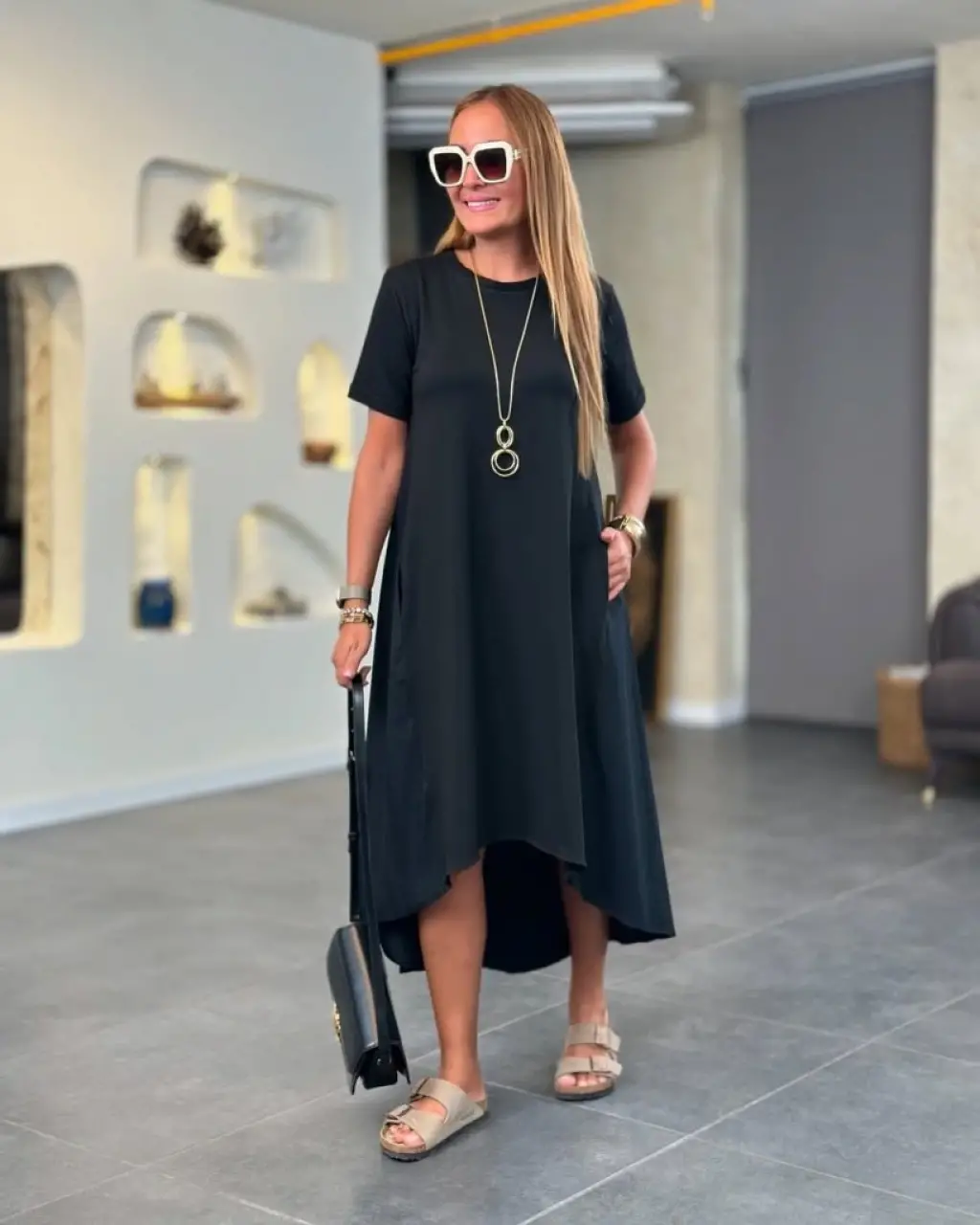 Kadın Kısa Kollu Bisiklet Yaka Asimetrik Kesim ön Viskon Arkası Trikoton Elbise